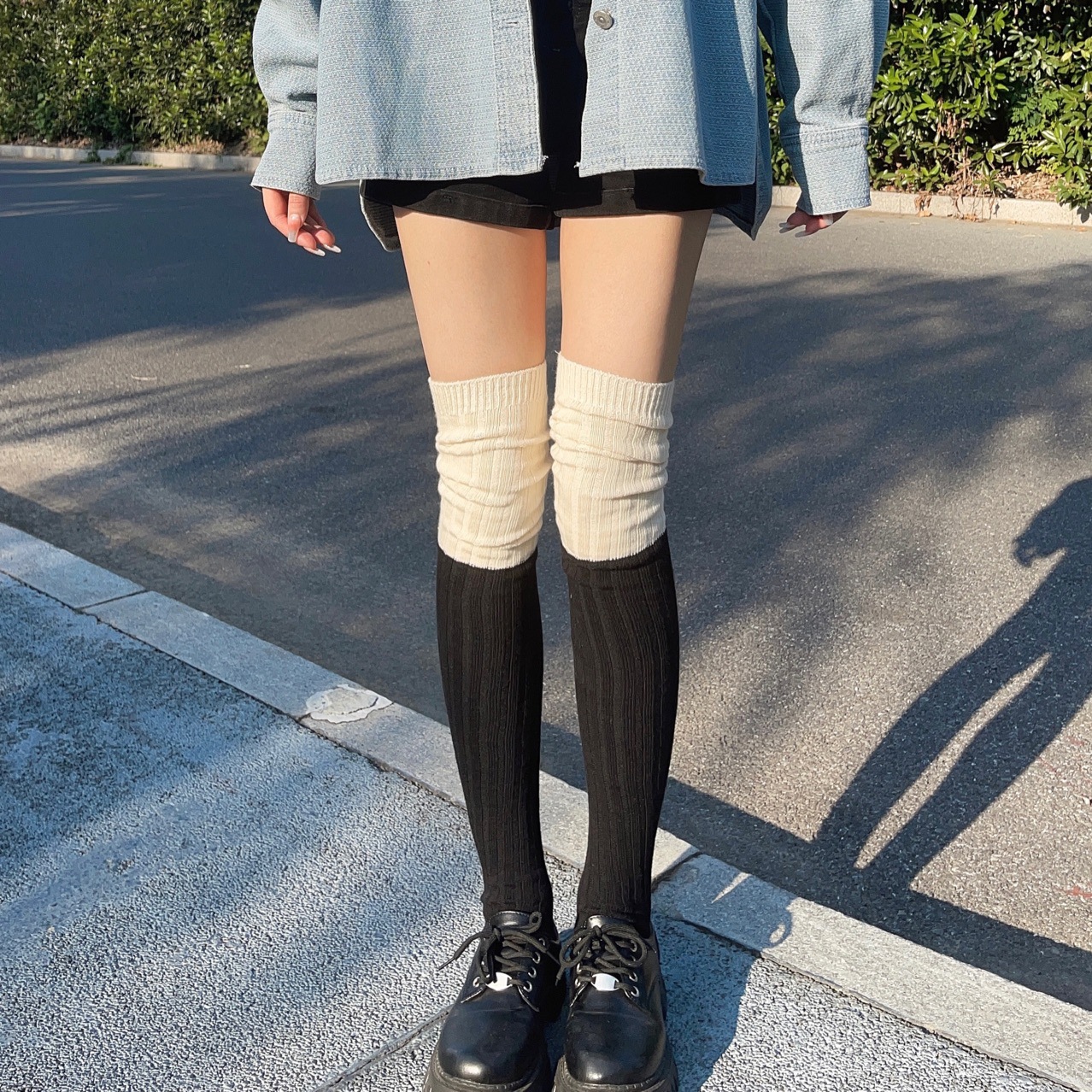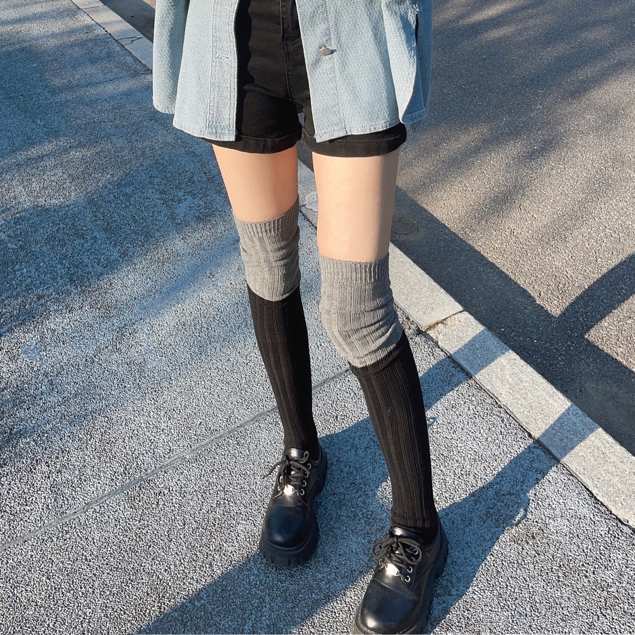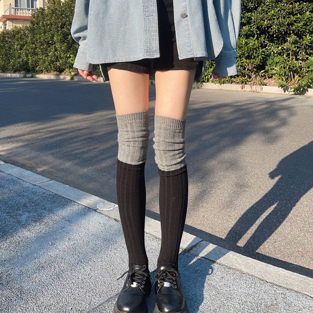 두꺼운 면 니트 줄무늬 검은 색과 회색 색상 일치 대조 색상 무릎 더미 높은 양말 조수 양말스토어 가기