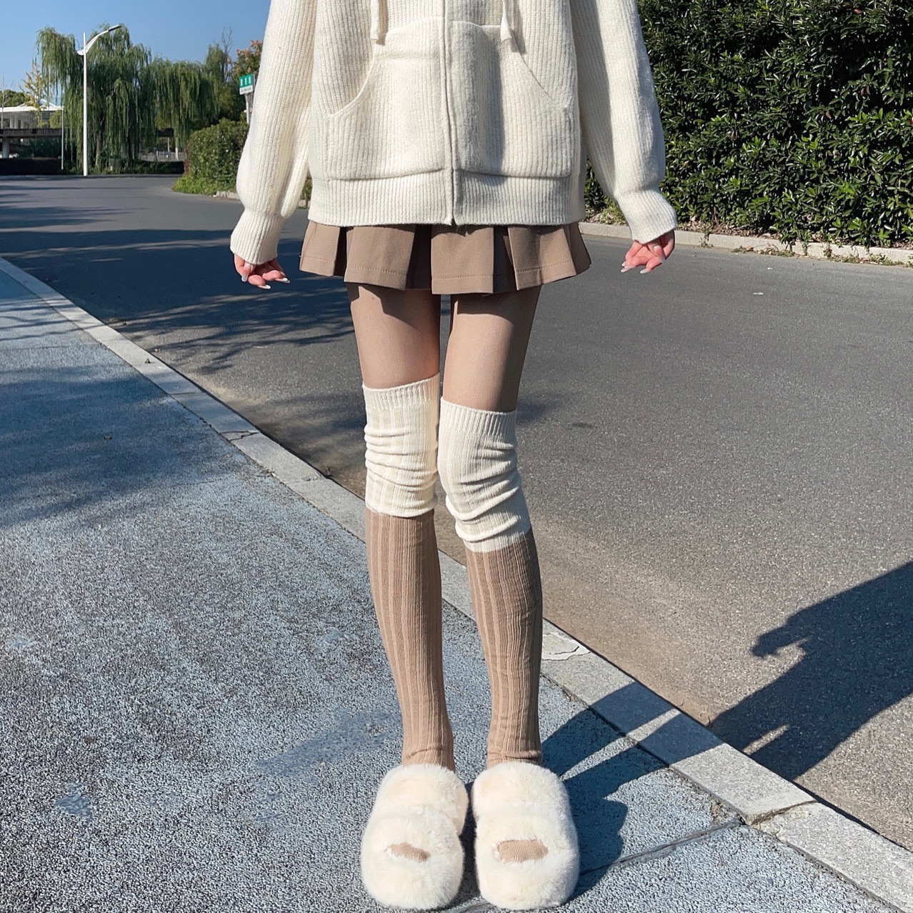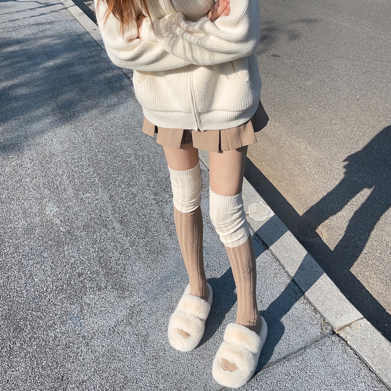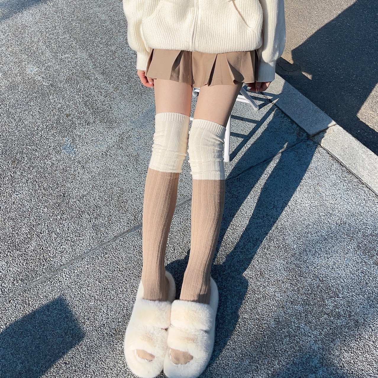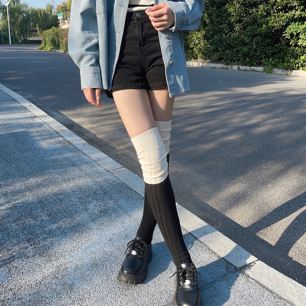 두꺼운 면 니트 줄무늬 검은 색과 회색 색상 일치 대조 색상 무릎 더미 높은 양말 조수 양말스토어 가기