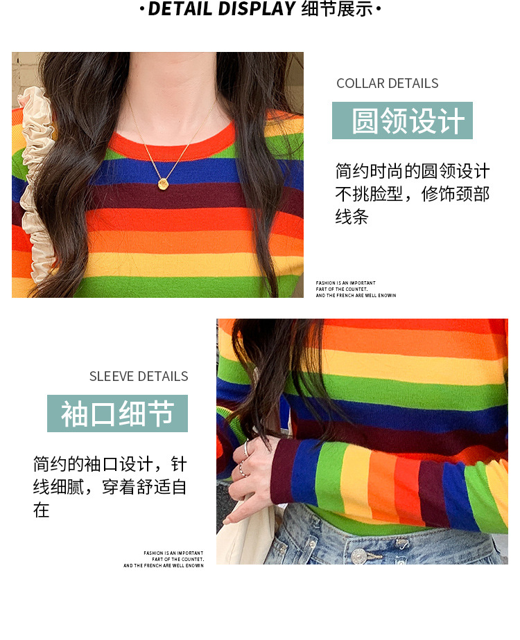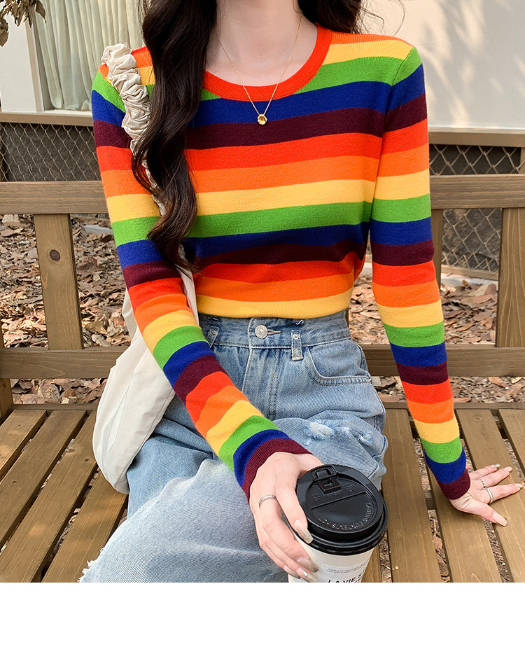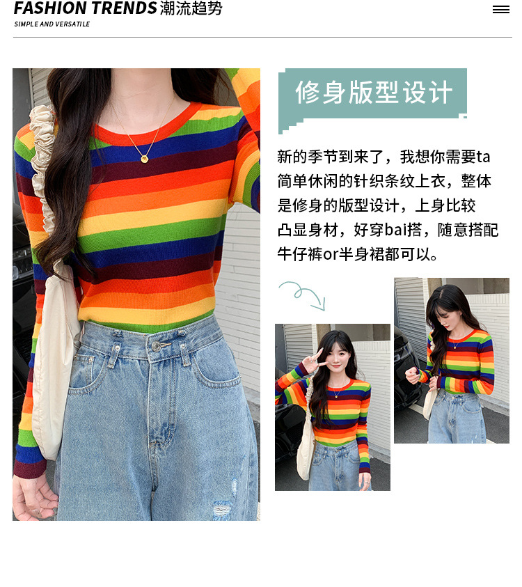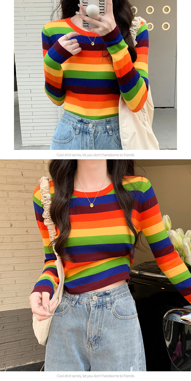 리얼 샷 레인보우 스트라이프 니트 셔츠베이스 안감 긴 소매 티셔츠 여성용 얇은 봄 이른 가을 탑 스웨터 짧은스토어 가기