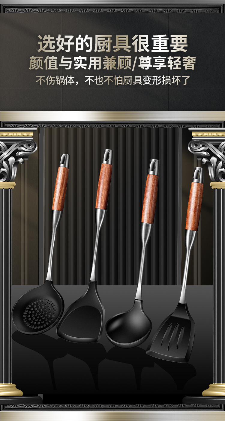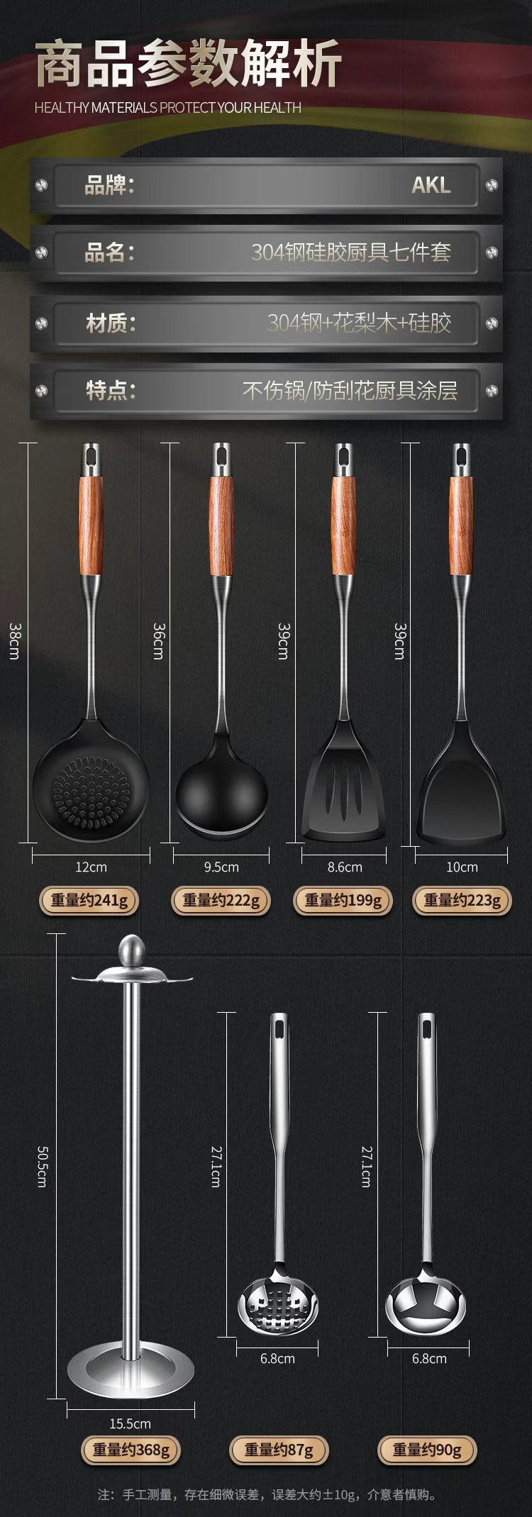 304 스테인레스 스틸 실리콘 주방 용품 세트, 화상 방지 붙지 않는 프라이팬, 주걱, 고급스러운 로즈우드 소쿠리 및 스푼스토어 가기