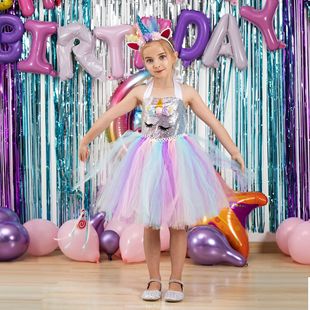 • 外贸童装万圣节cospaly彩虹亮片独角礼服裙女童连衣裙公主裙tutu