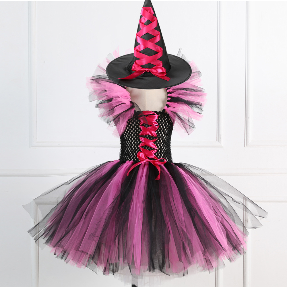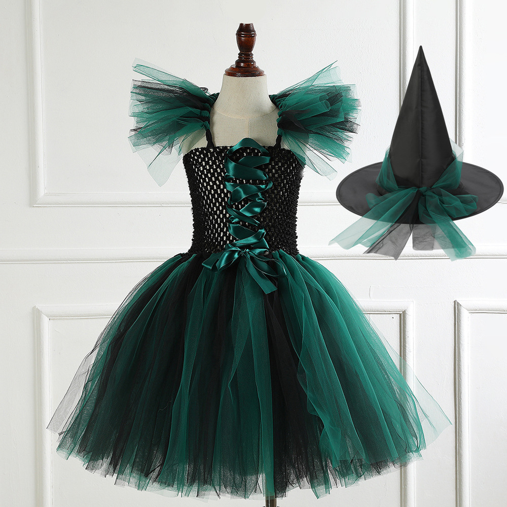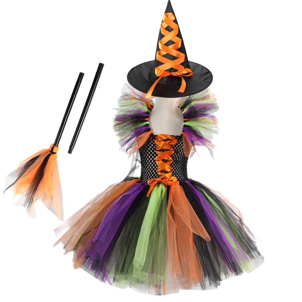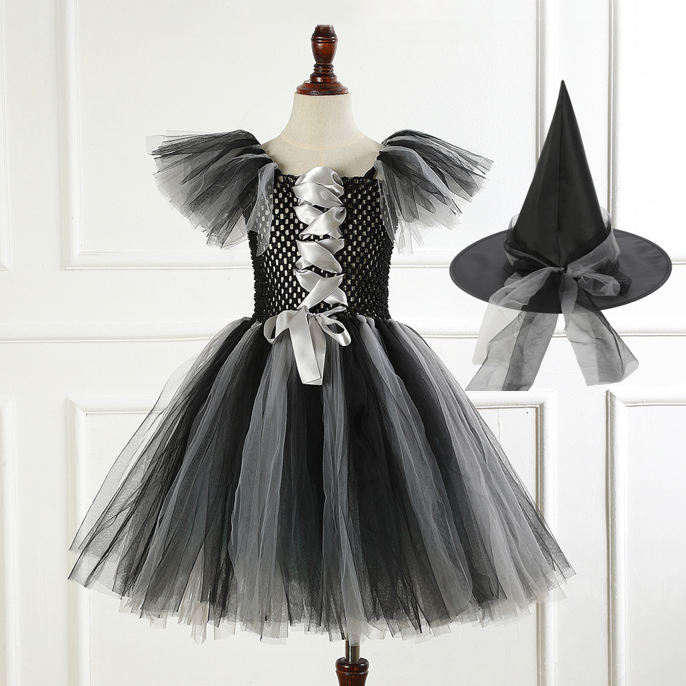 • 万圣节欧美童装长款女巫女童连衣裙送头饰表演网纱礼服鬼节公主裙