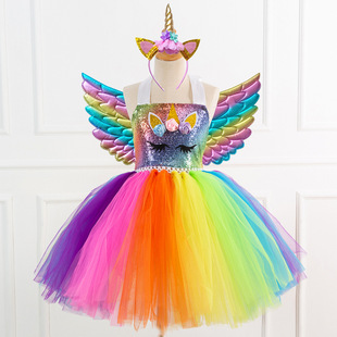 • 2023新款彩虹亮片女童连衣裙欧美公主裙卡通独角蓬蓬裙送翅膀头饰