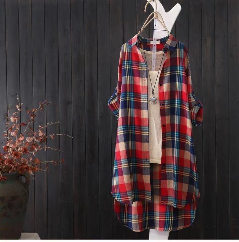 2023 봄과 가을 새로운 폭발 중간 길이 한국 스타일 셔츠 격자 무늬 셔츠 여성용 루즈한 플러스 사이즈 긴팔 자외선 차단제 코트스토어 가기