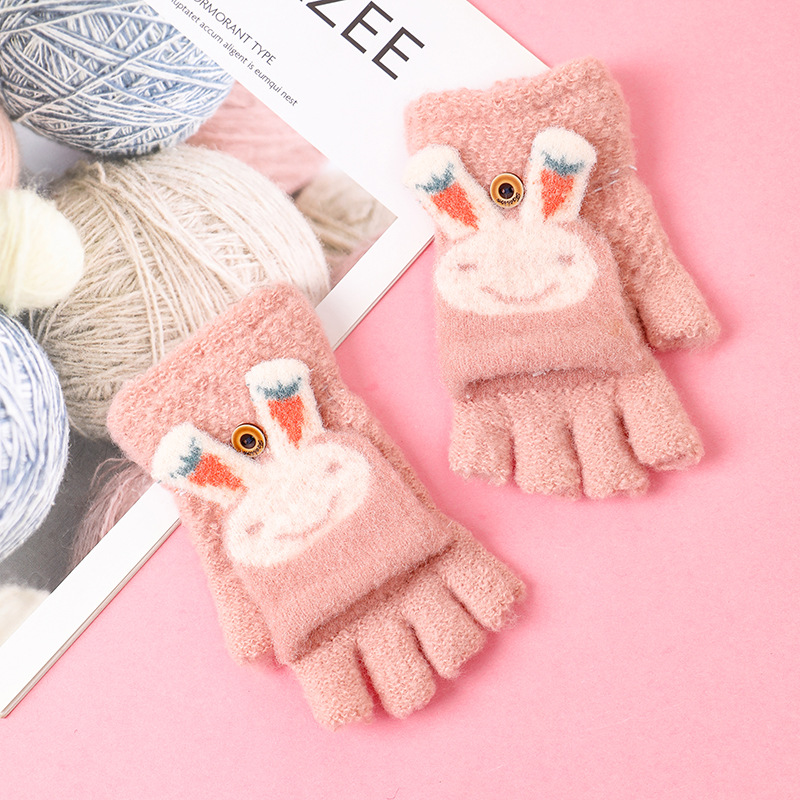 가을과 겨울 기모 가을 및 겨울 중학생 큰 어린이 초등학생을위한 가을 겨울 따뜻한 귀여운 만화 반 손가락 뜨개질 열린 손가락 장갑 뒤집기