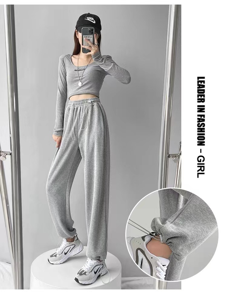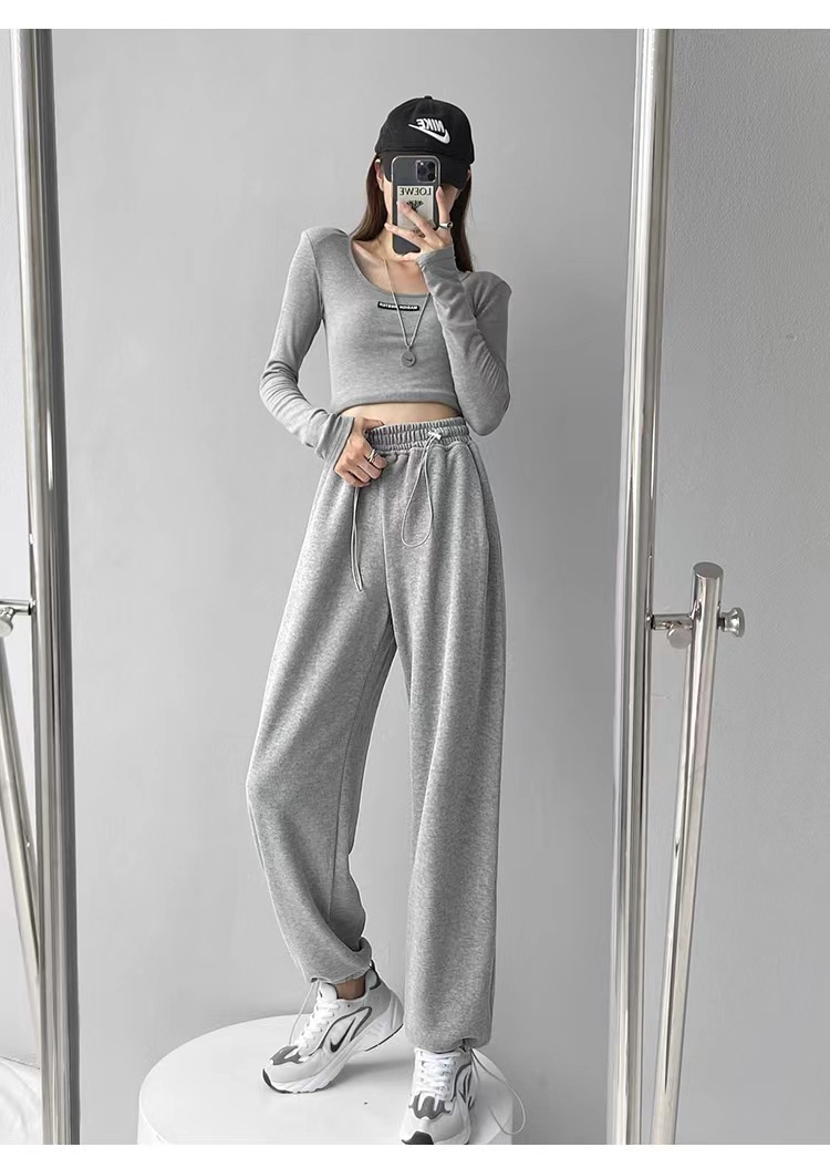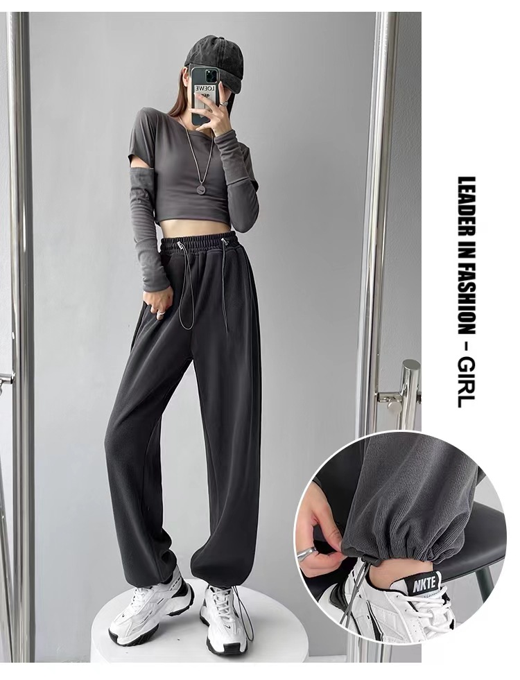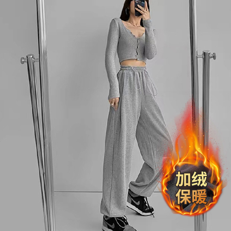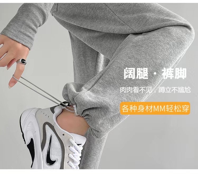 그레이 티 가을과 겨울 두꺼운 블랙 스포츠 바지 여자의 봄과 가을 캐주얼 바지 새로운 슬리밍 기모 와이드 레그 바지
