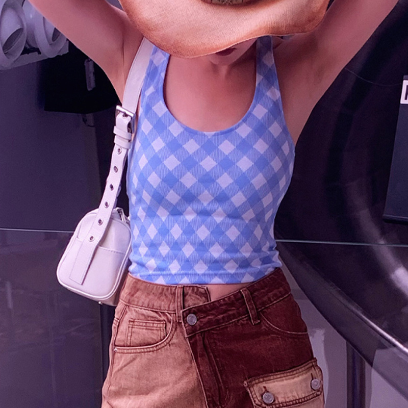 요가 의류 여성의 아름다운 등받이 목 격자 무늬 인쇄 가슴 패드 스포츠 피트니스 조끼 댄스 훈련 속건 탑스토어 가기