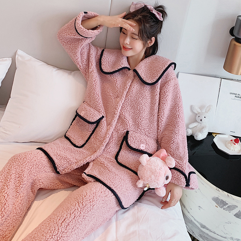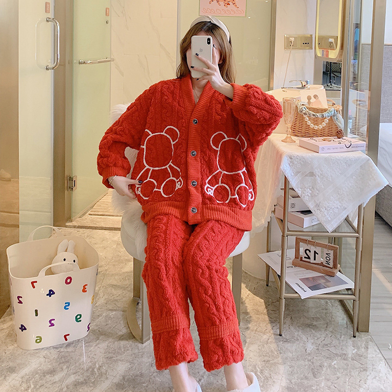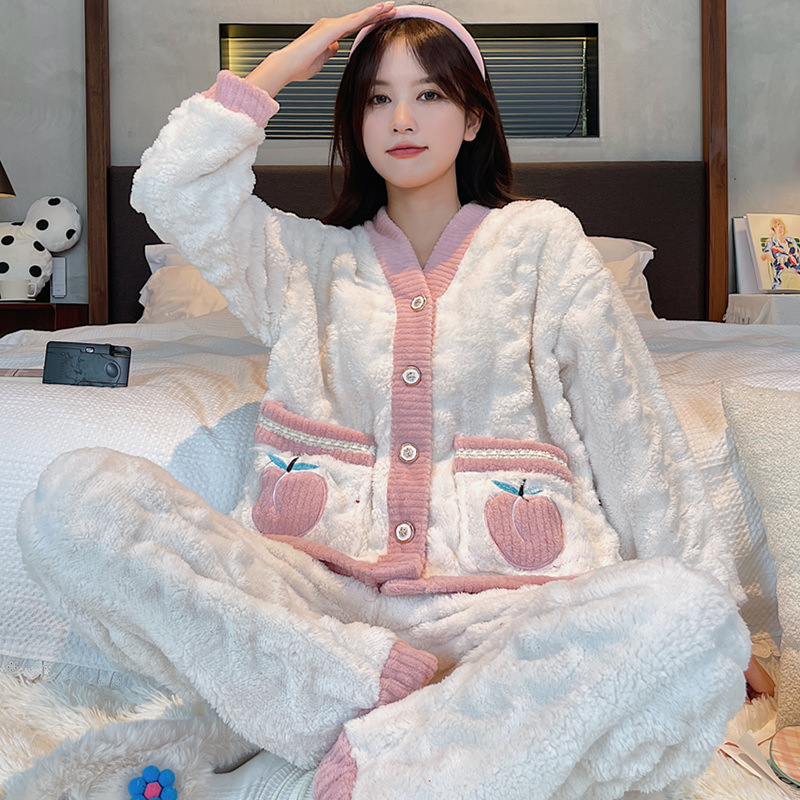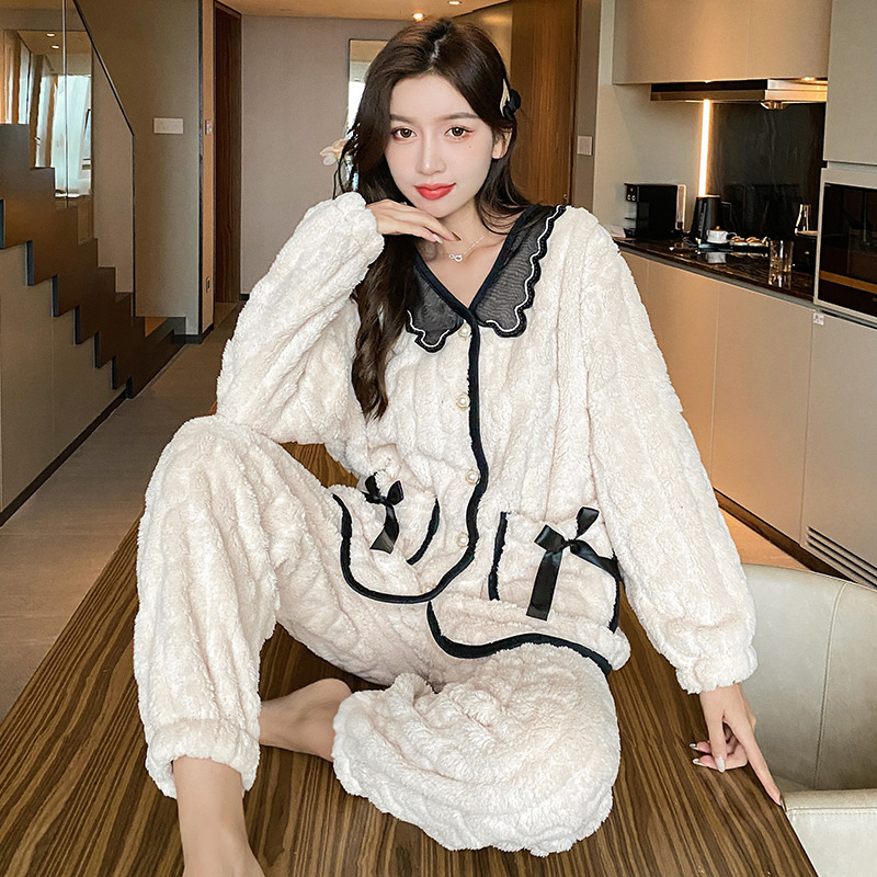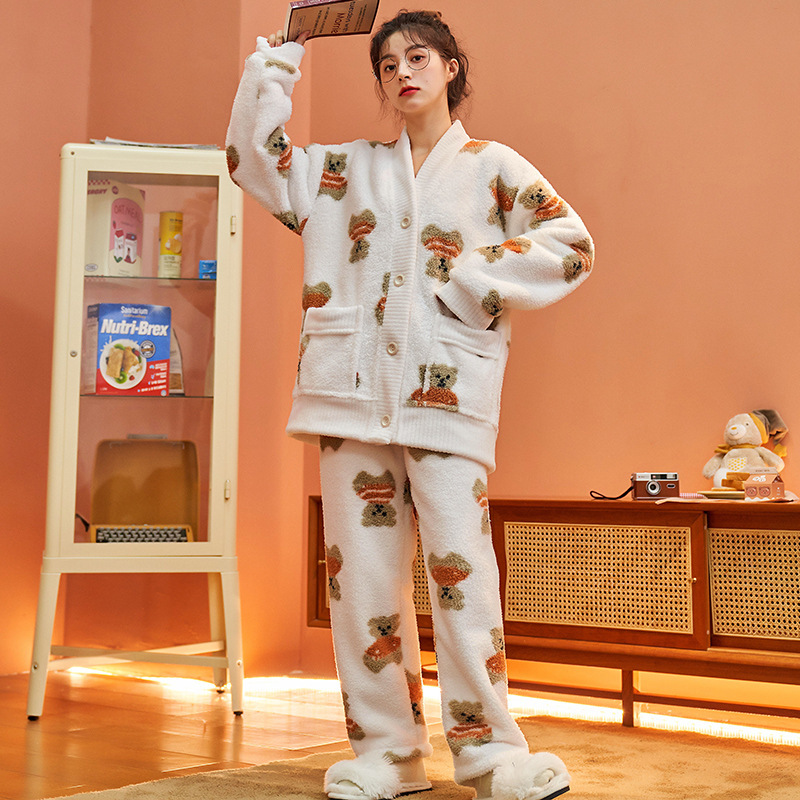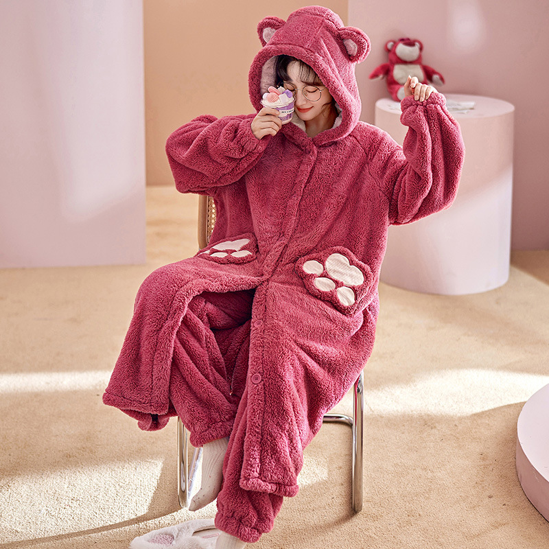 秋冬珊瑚绒女加厚加绒保暖睡衣宽松开衫甜美可爱可外穿家居服代发