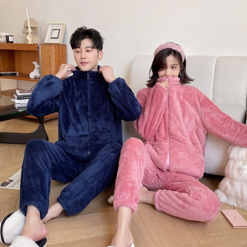 新款法兰绒情侣睡衣女冬季长袖保暖套装纯色拉链开衫小立领家居服