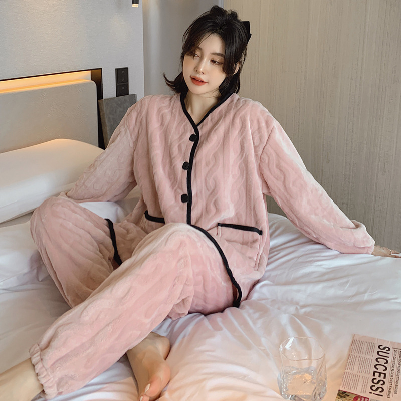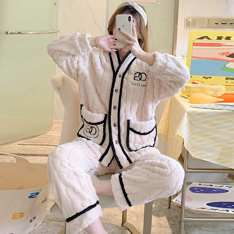 新款珊瑚绒睡衣女秋冬加厚保暖开衫套装网红直播爆款家居服可外穿