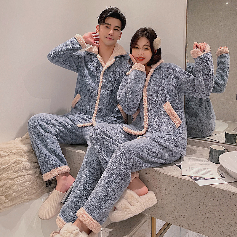 羊羔绒睡衣女秋冬加绒加厚情侣套装男士保暖可外穿家居服一件代发