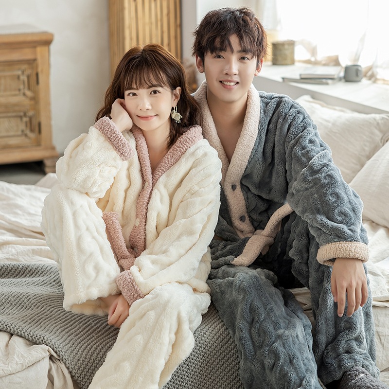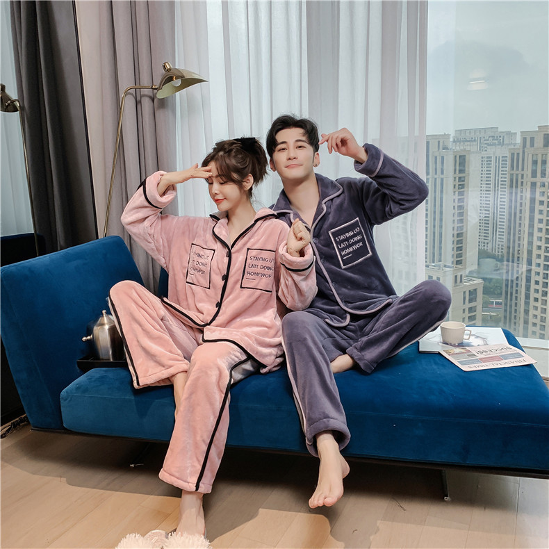秋冬新款法兰绒情侣睡衣女加厚加绒开衫套装可外穿男士保暖家居服