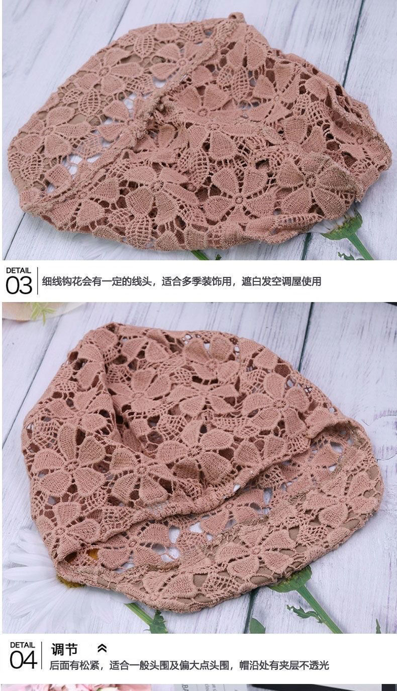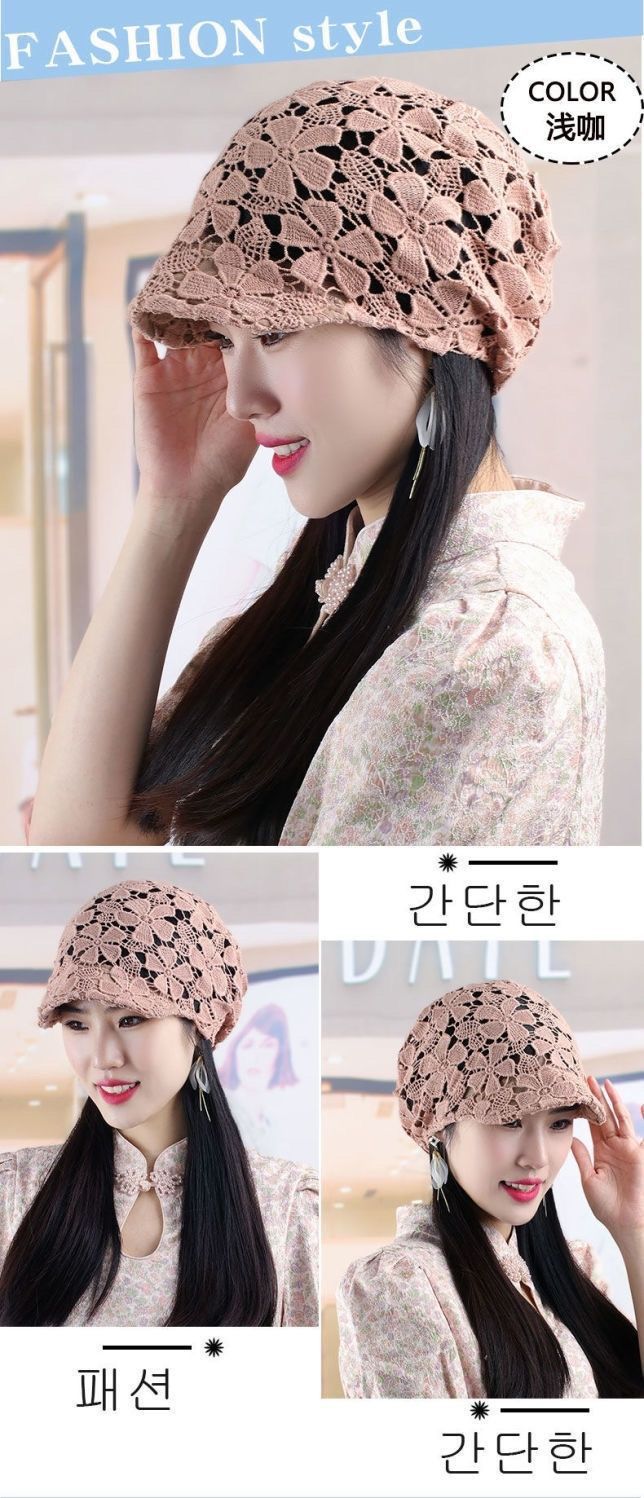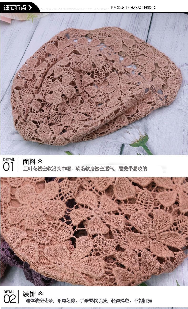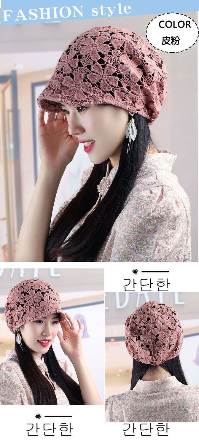 봄/여름 2022 새로운 중공 꽃 크로 셰 뜨개질 소프트 림 Baotou 모자 통기성 니트 터번 모자 화이트 헤어 커버 모자 여성용스토어 가기