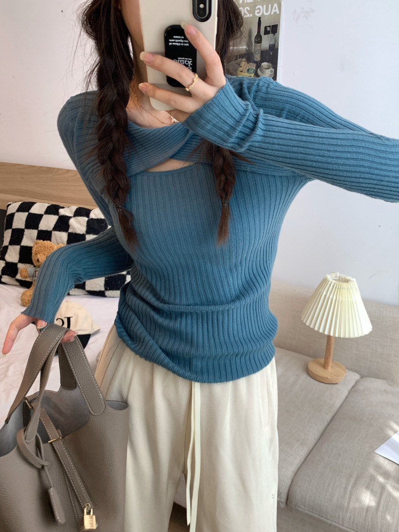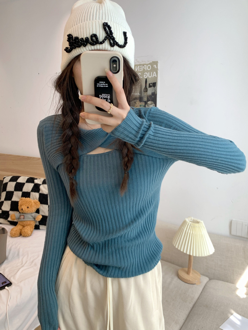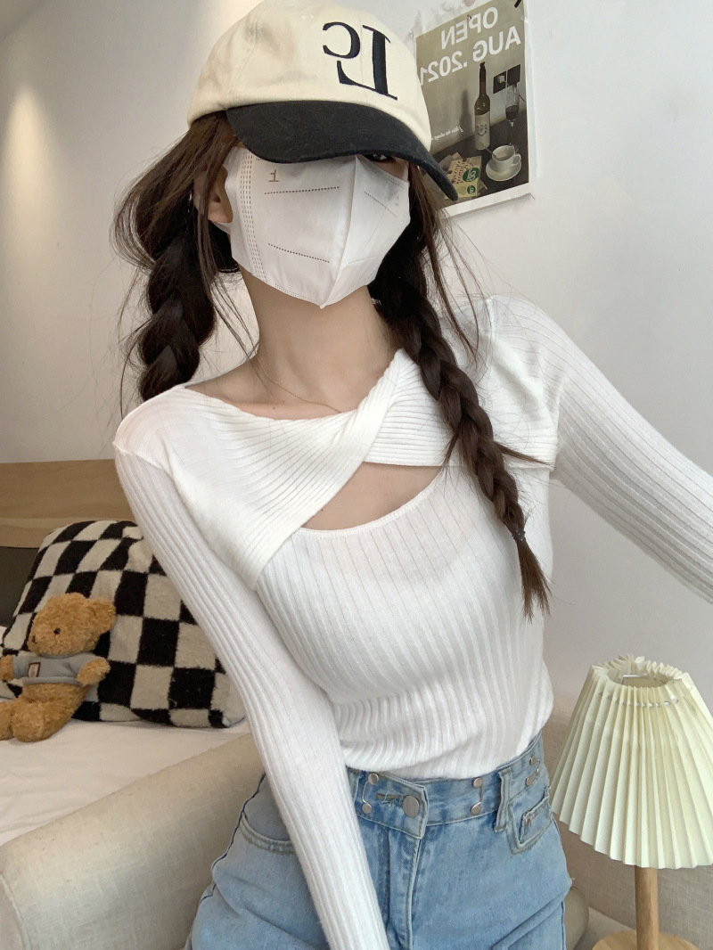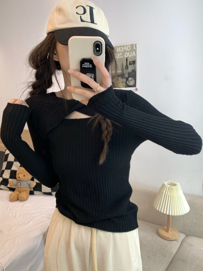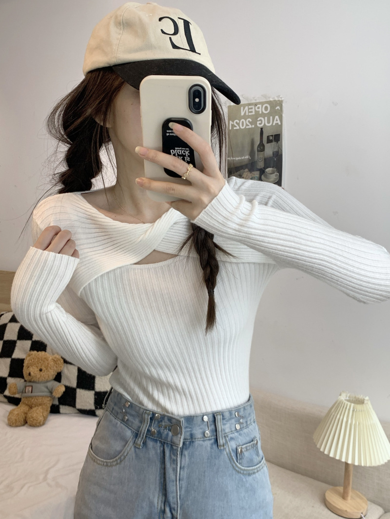 중공 긴팔 니트웨어 여성 가을 2022 새로운 슬림핏 슬리밍 스트레치 내부 베이스 탑 조심