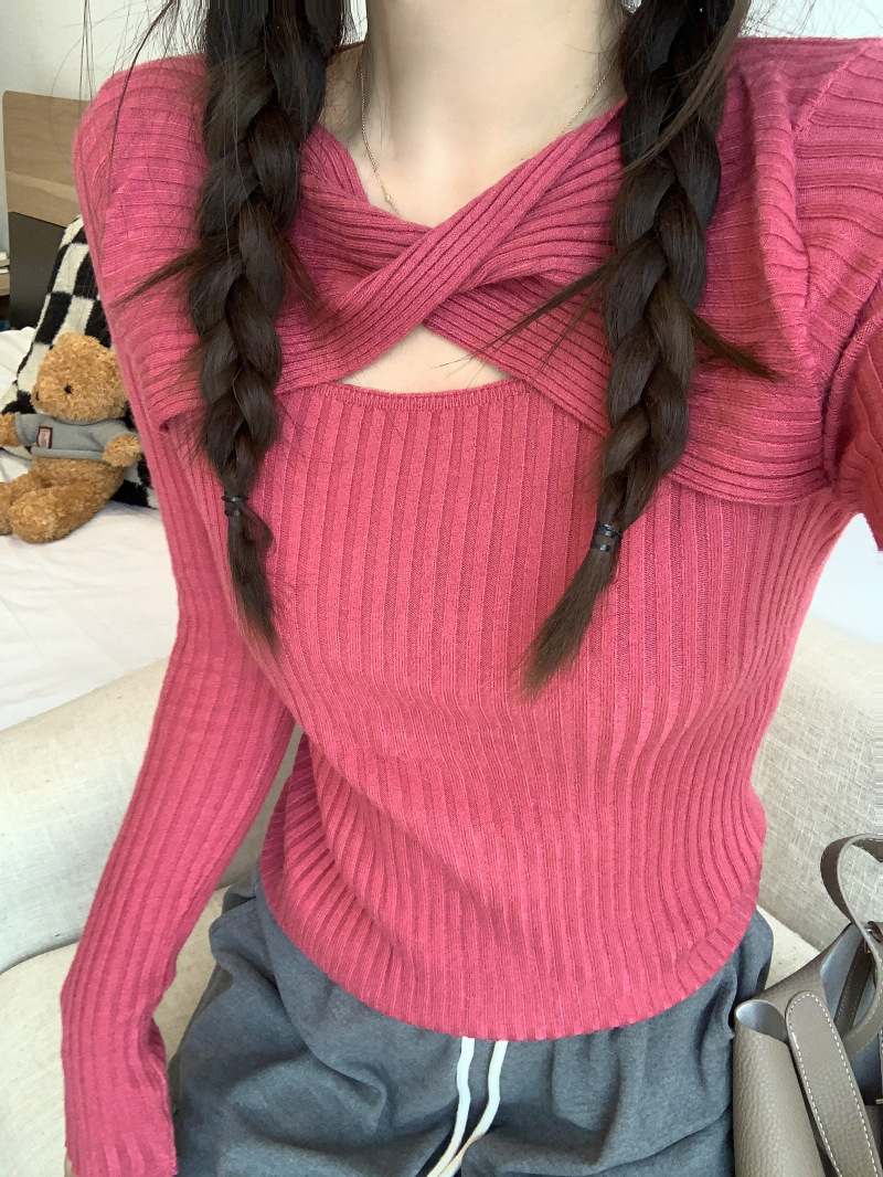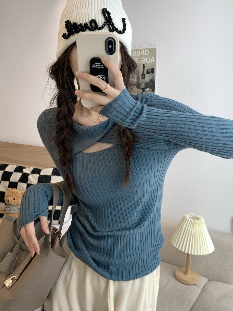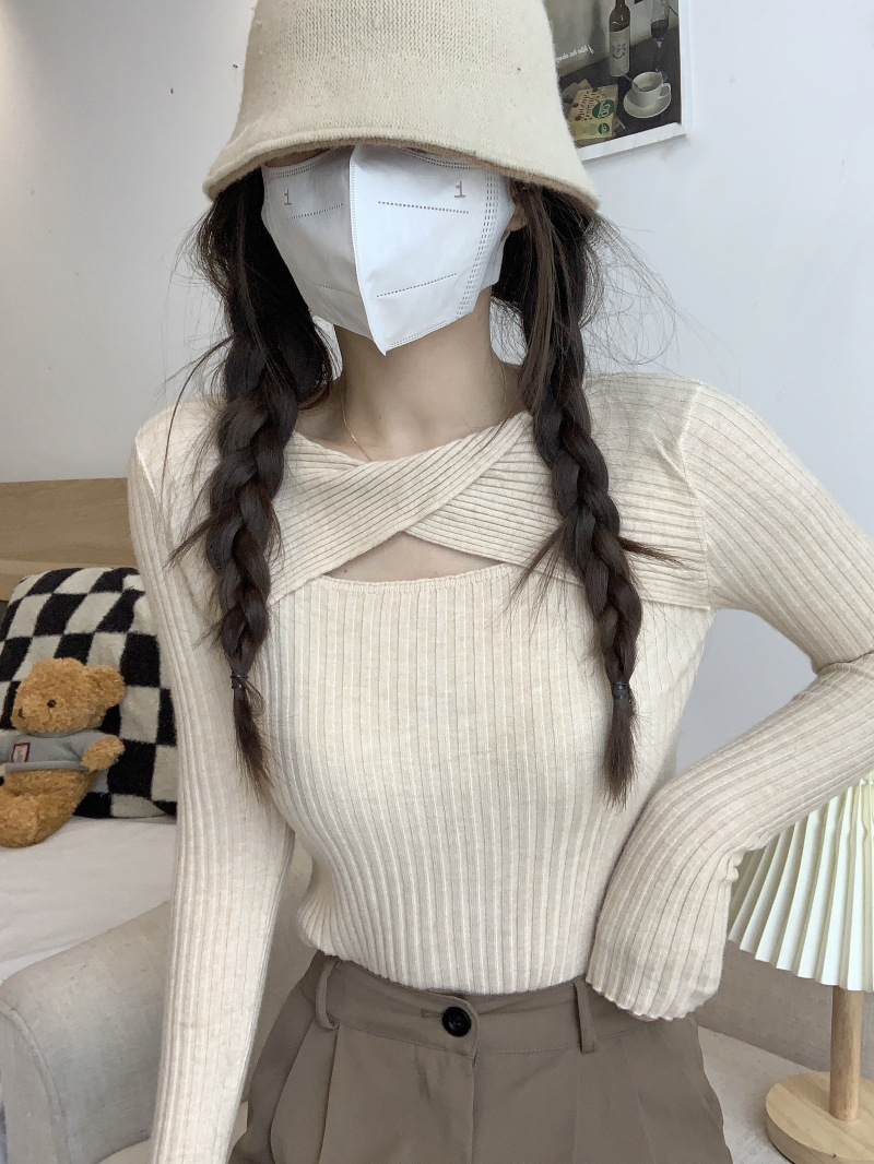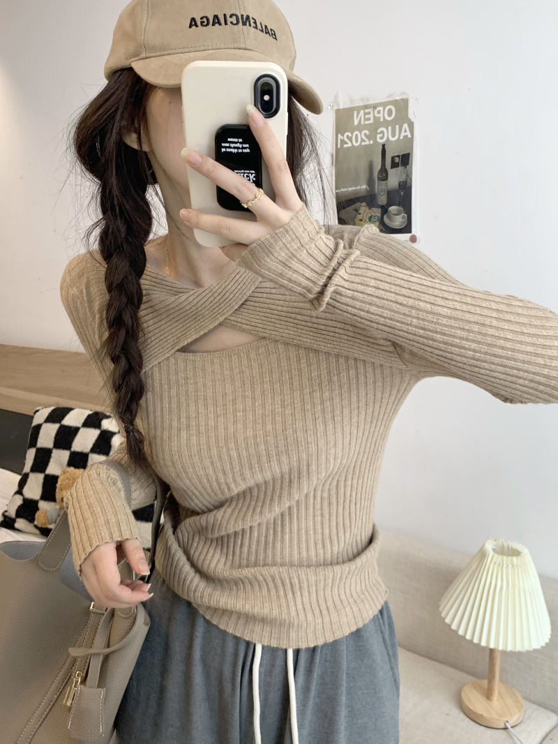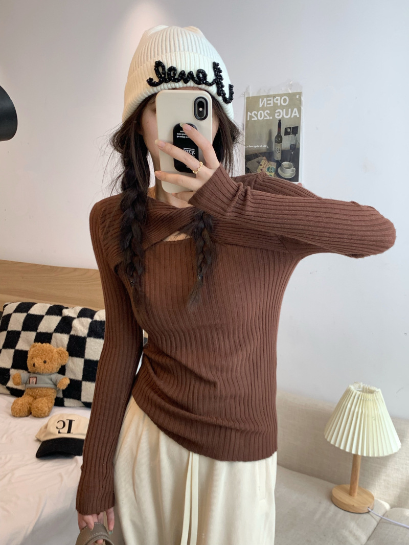 중공 긴팔 니트웨어 여성 가을 2022 새로운 슬림핏 슬리밍 스트레치 내부 베이스 탑 조심
