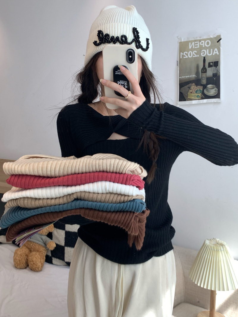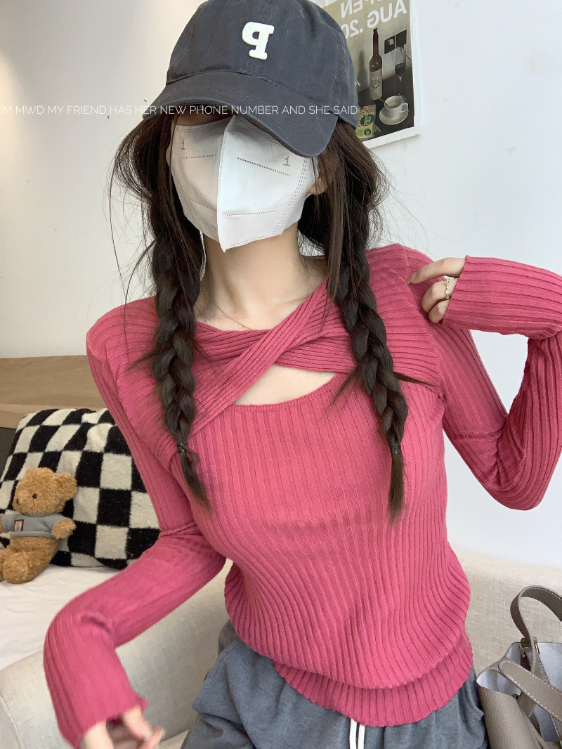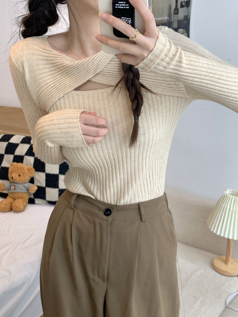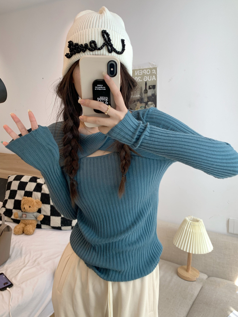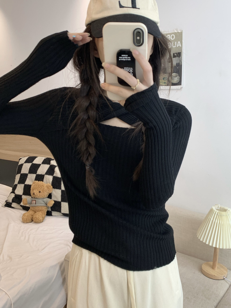 중공 긴팔 니트웨어 여성 가을 2022 새로운 슬림핏 슬리밍 스트레치 내부 베이스 탑 조심스토어 가기