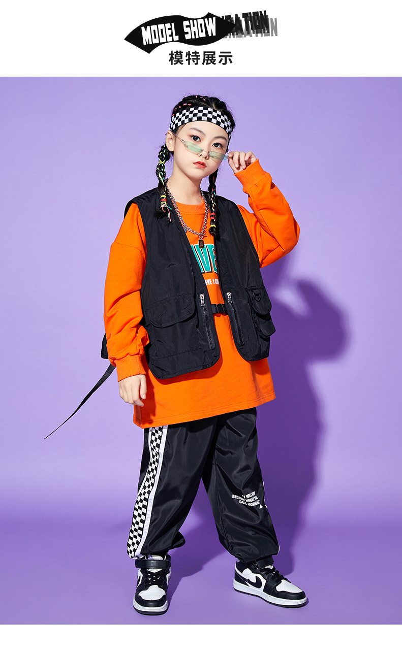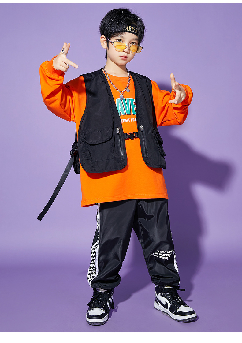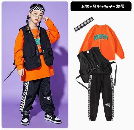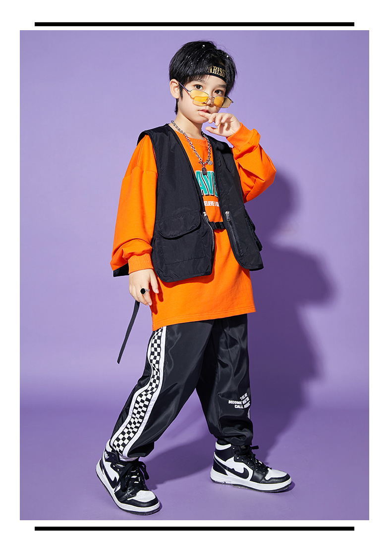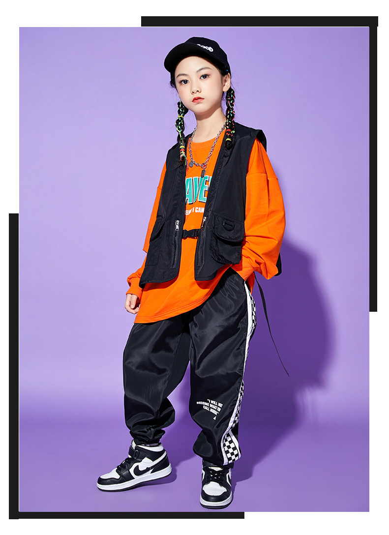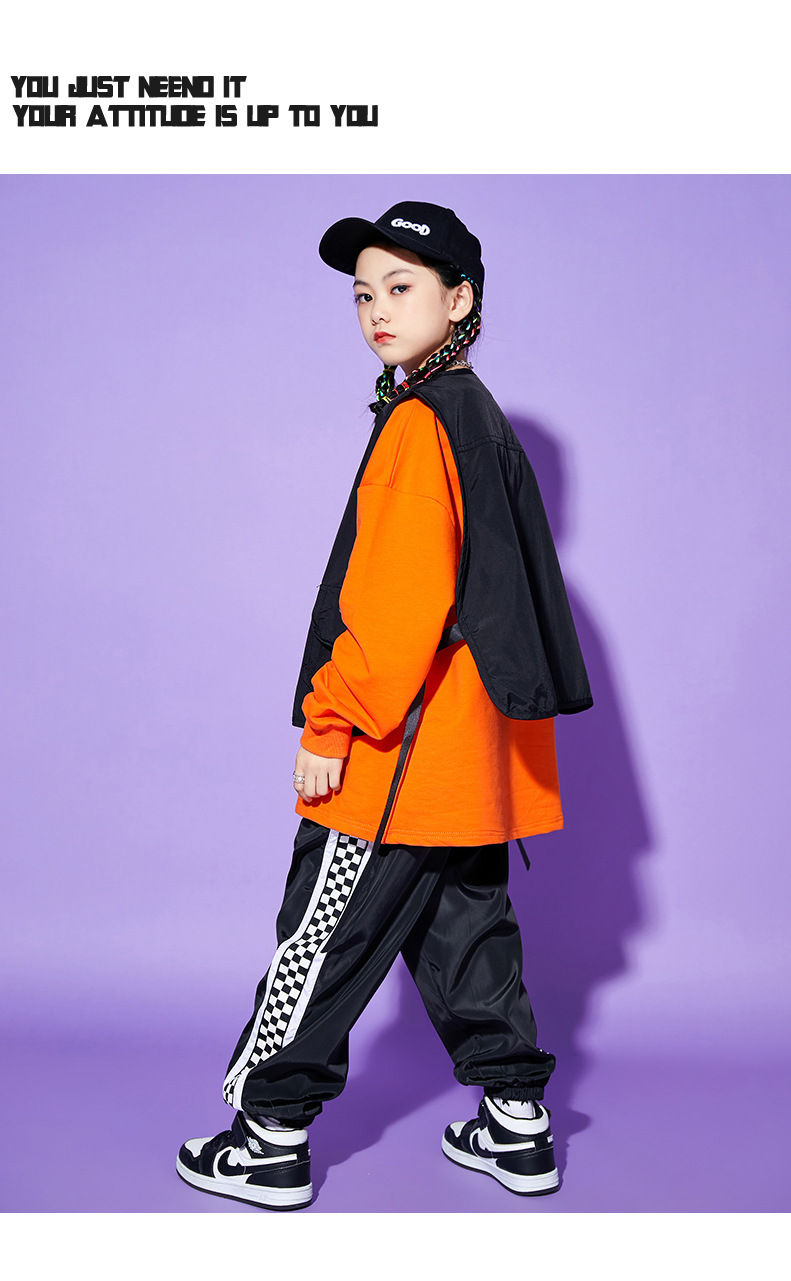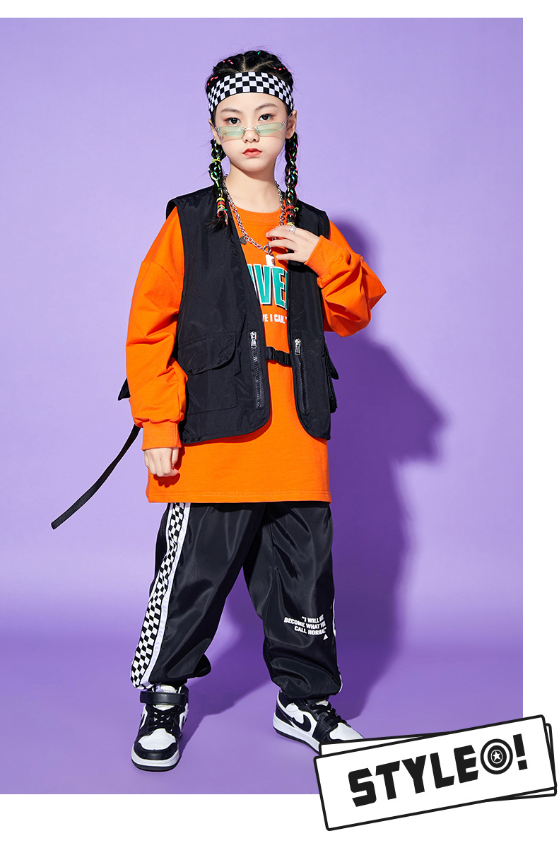 • A1101 오렌지 스웨트 + A502 블랙 조끼 + 체크 무늬 블랙 팬츠 + 체크 무늬 헤어밴드