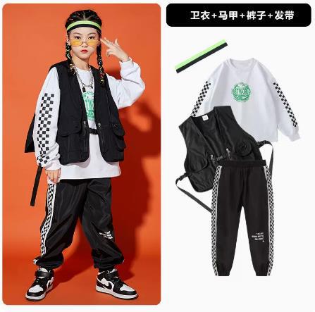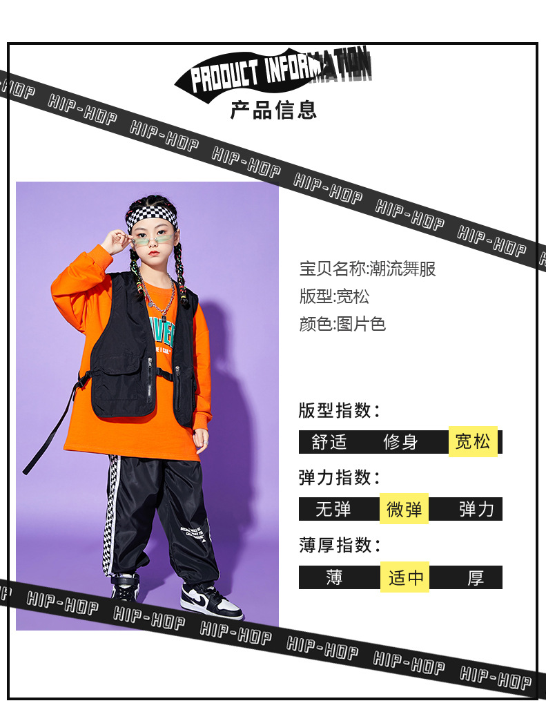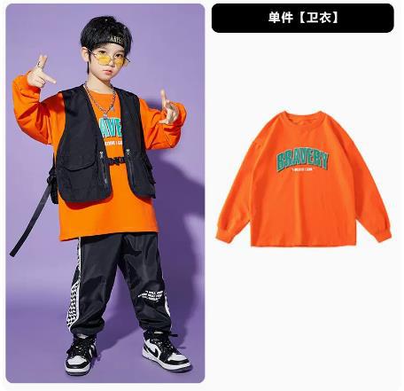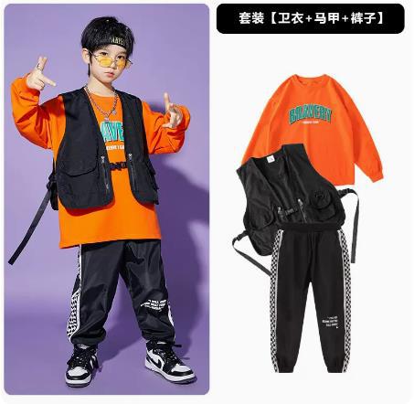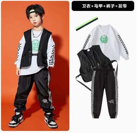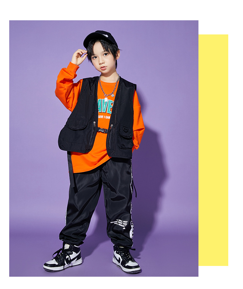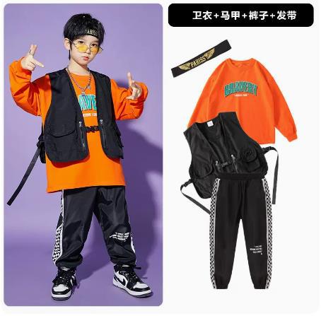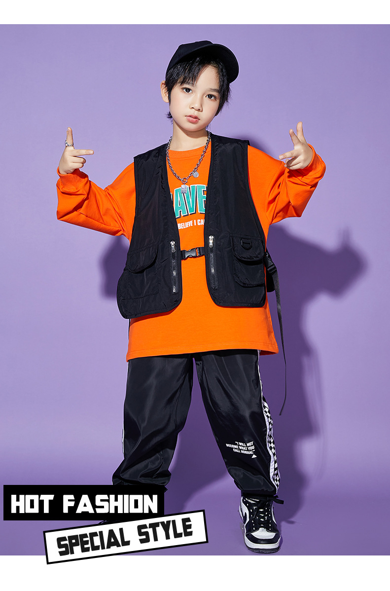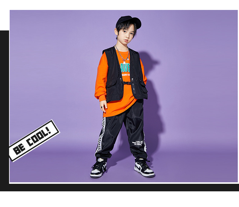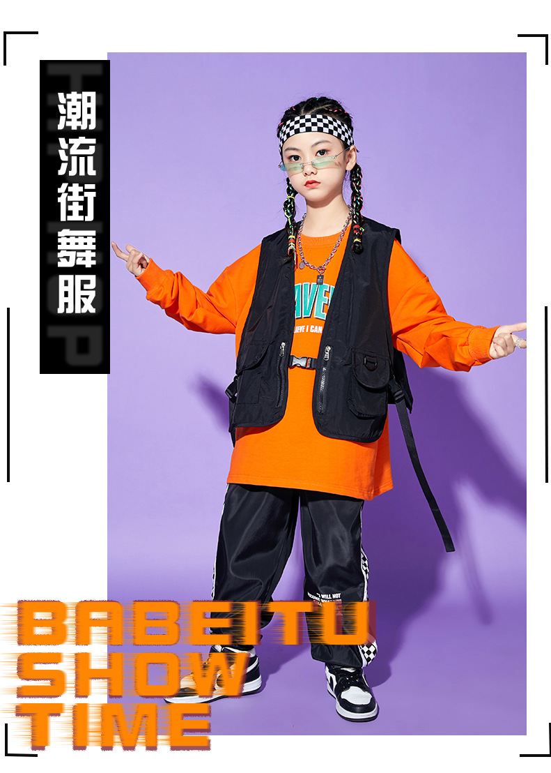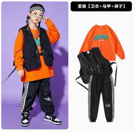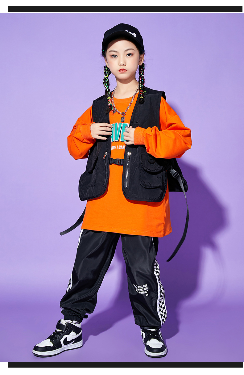 • A1101 오렌지 스웨트 + A502 블랙 조끼 + 체크 무늬 블랙 팬츠 + 체크 무늬 헤어밴드