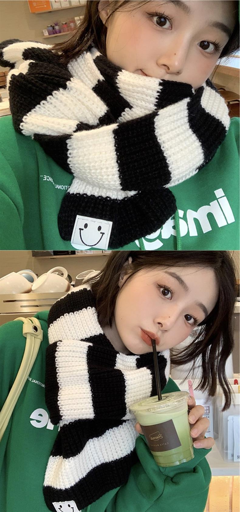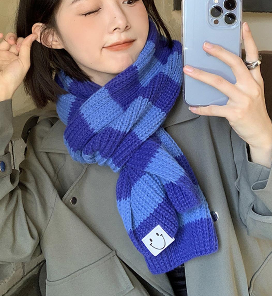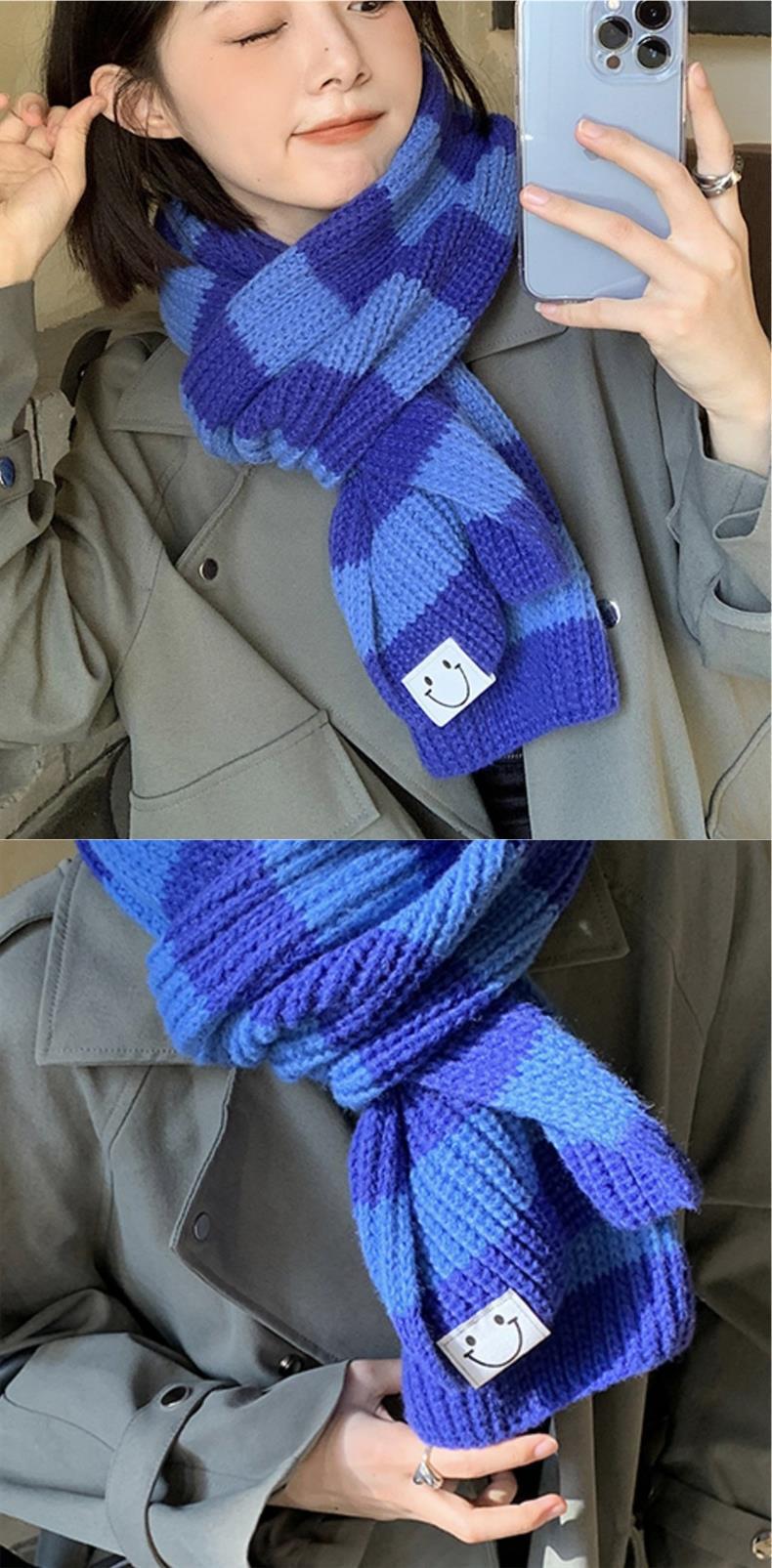 한국식 울 스카프 여성용 가을과 겨울 일본식 클라인 블루 숄 모든 매치 따뜻한 니트 스트라이프 스마일 스카프