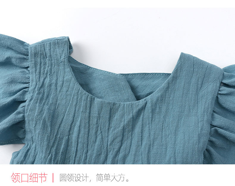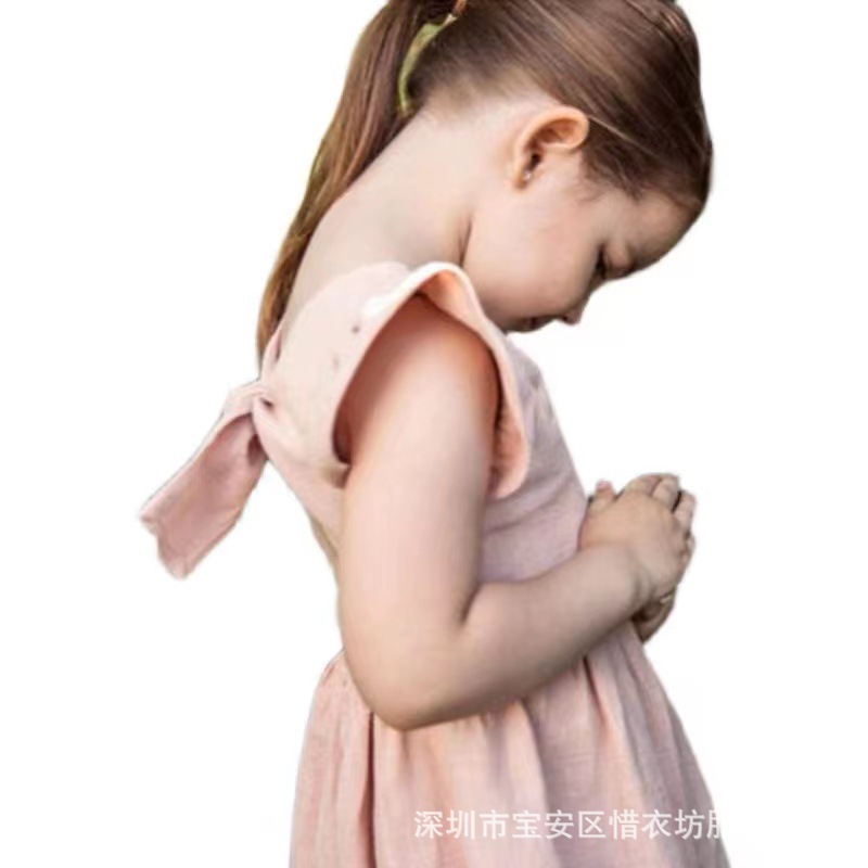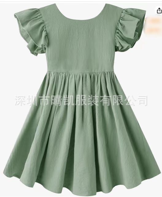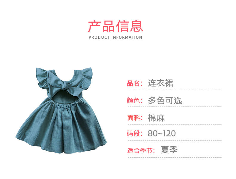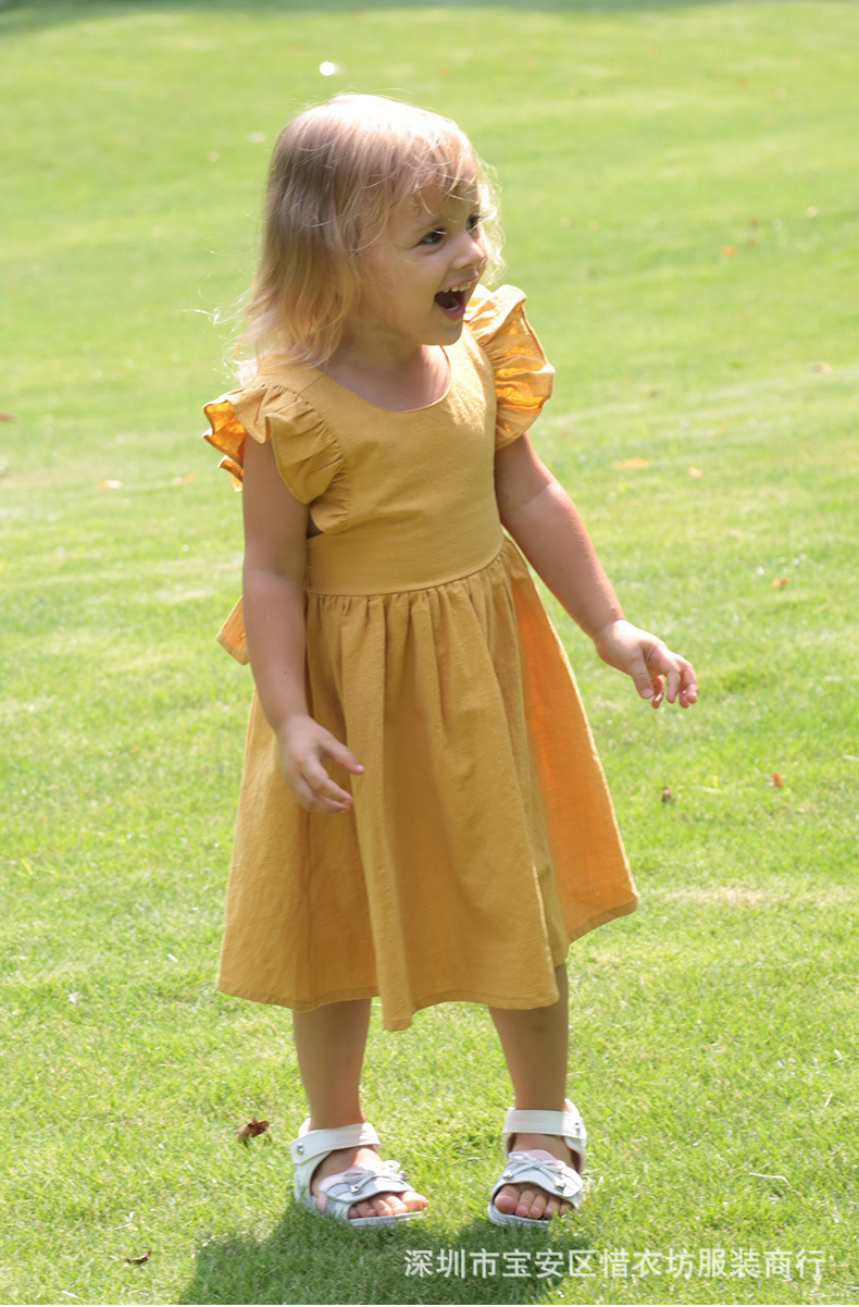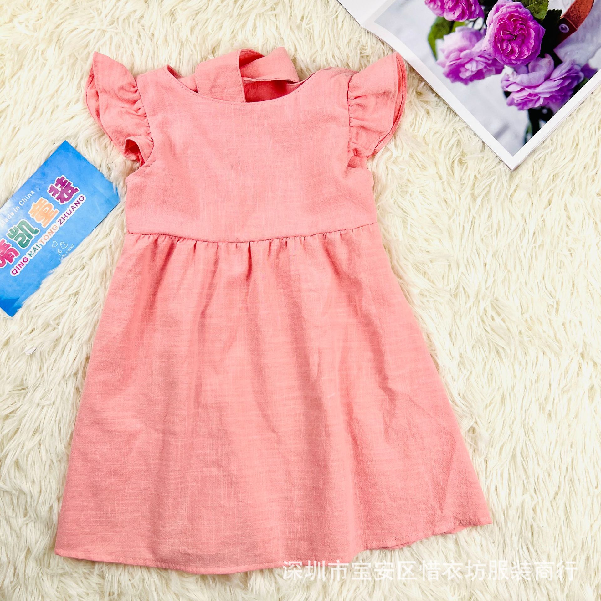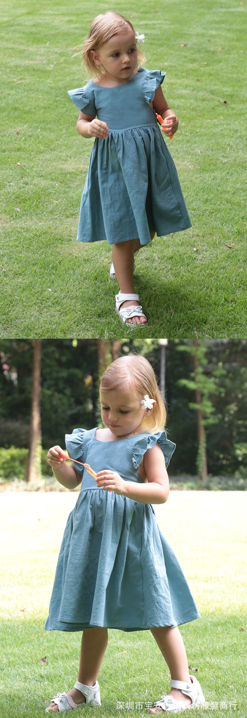 Qingkai 아동 의류 유럽과 미국 스타일 여자 여름 원피스 면 린넨 얇은 여성 아기 비행 소매 단색 등이없는 치마스토어 가기