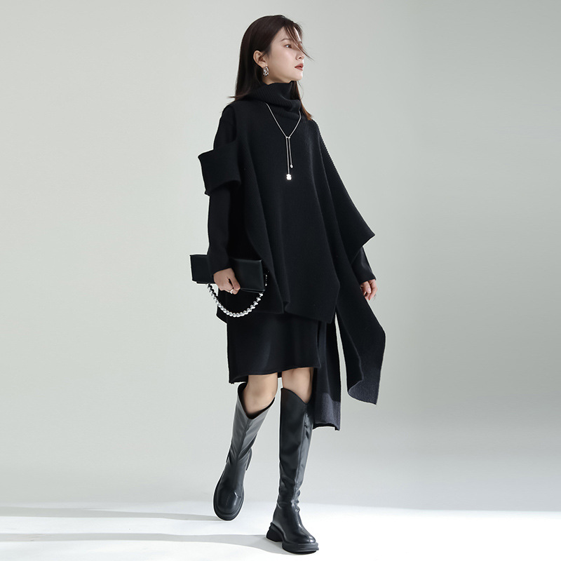 디자인 센스 틈새 니트 원피스 투피스 세트 여자의 불규칙한 스플릿 니트 원피스 느슨한 케이프 재킷스토어 가기