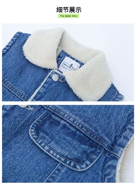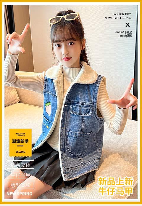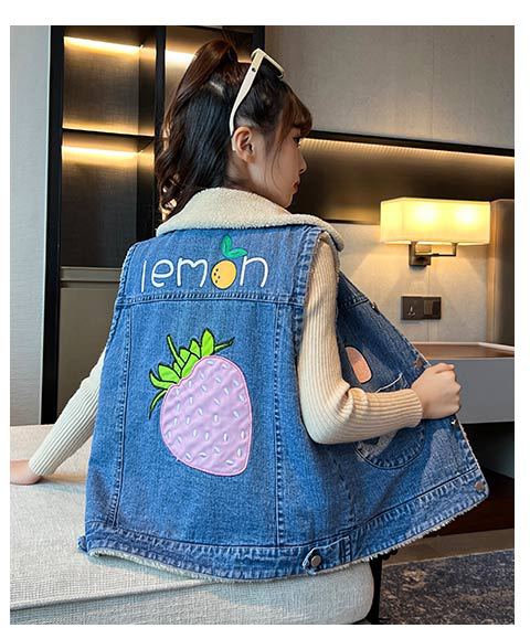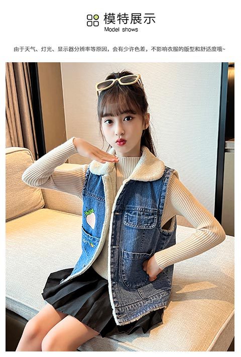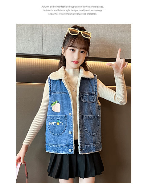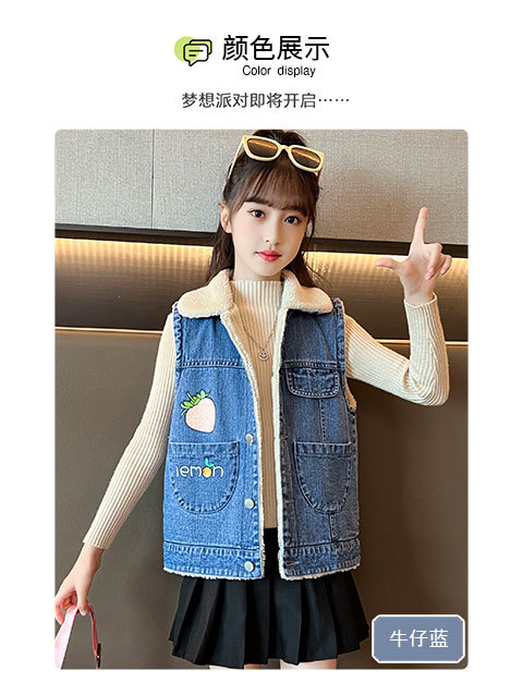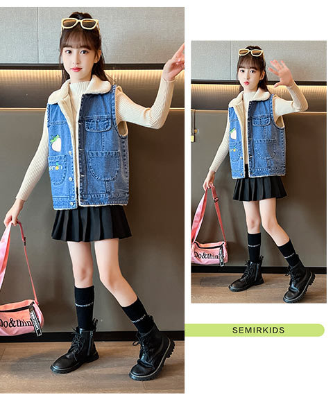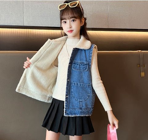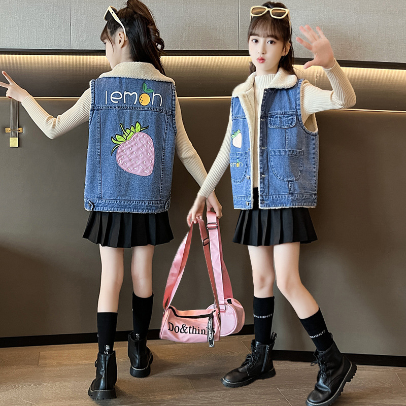 소녀를위한 데님 기모 조끼 가을 겨울 새로운 2024 한국 스타일 어린이 두꺼운 조끼 중 큰 어린이를위한 서양 스타일 겨울 패션스토어 가기