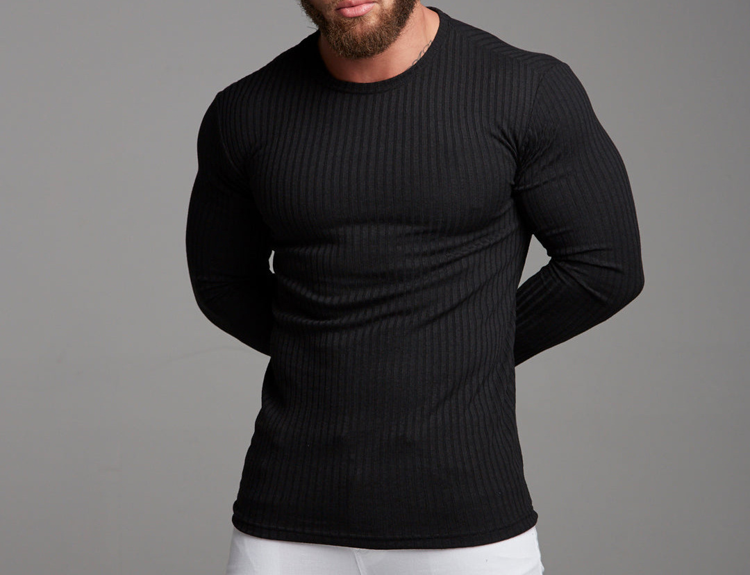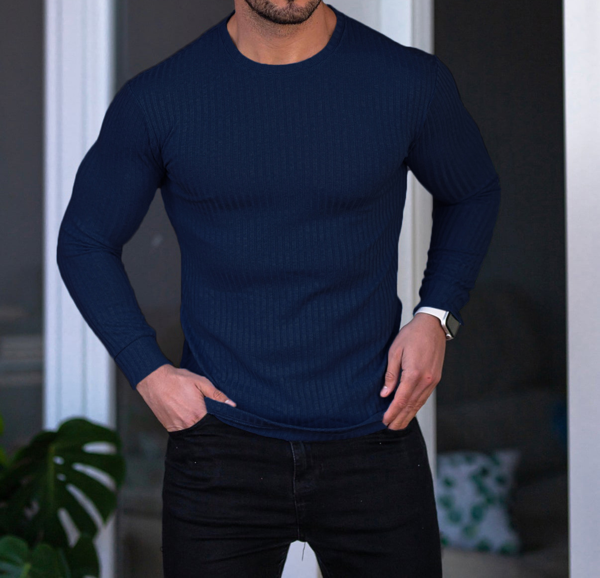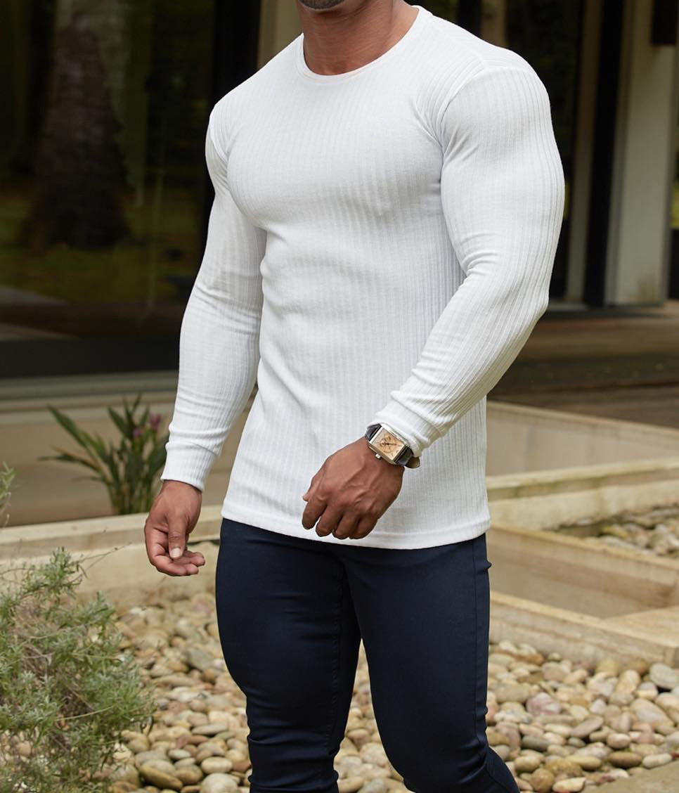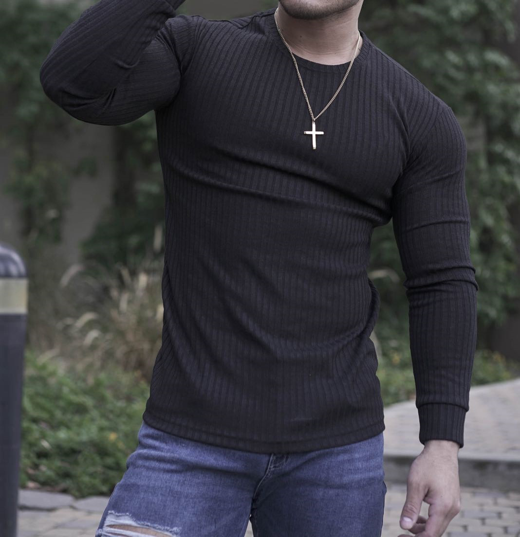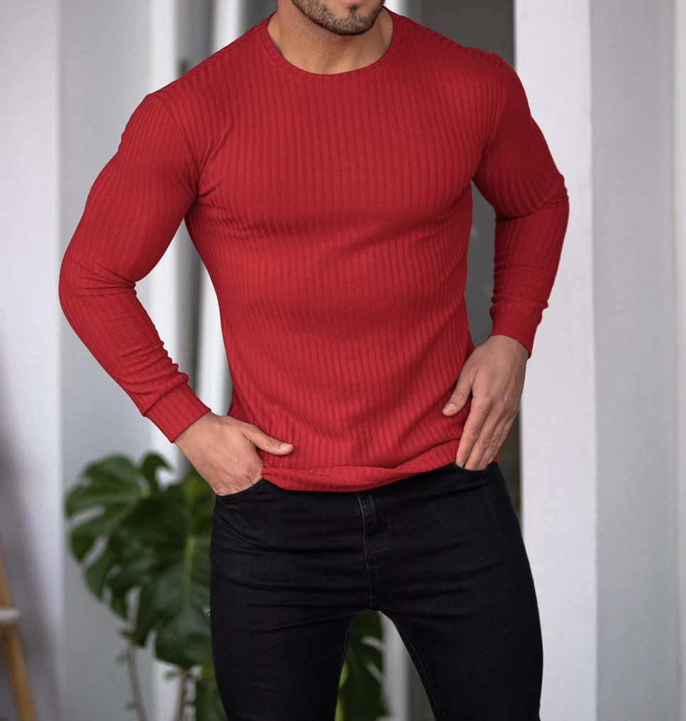 구미 국경 해외 무역 소원 남자 가을 스포츠 피트니스 레저 스탠드 칼라 탄성 세로 스트립 라운드 넥 긴팔 티셔츠