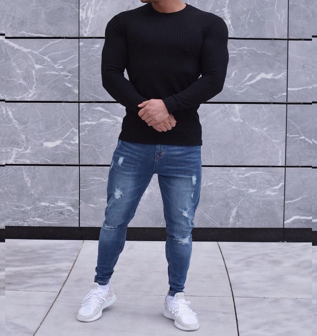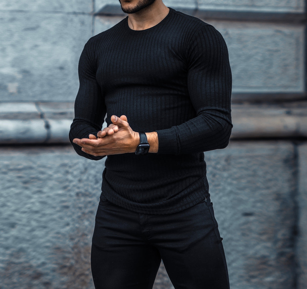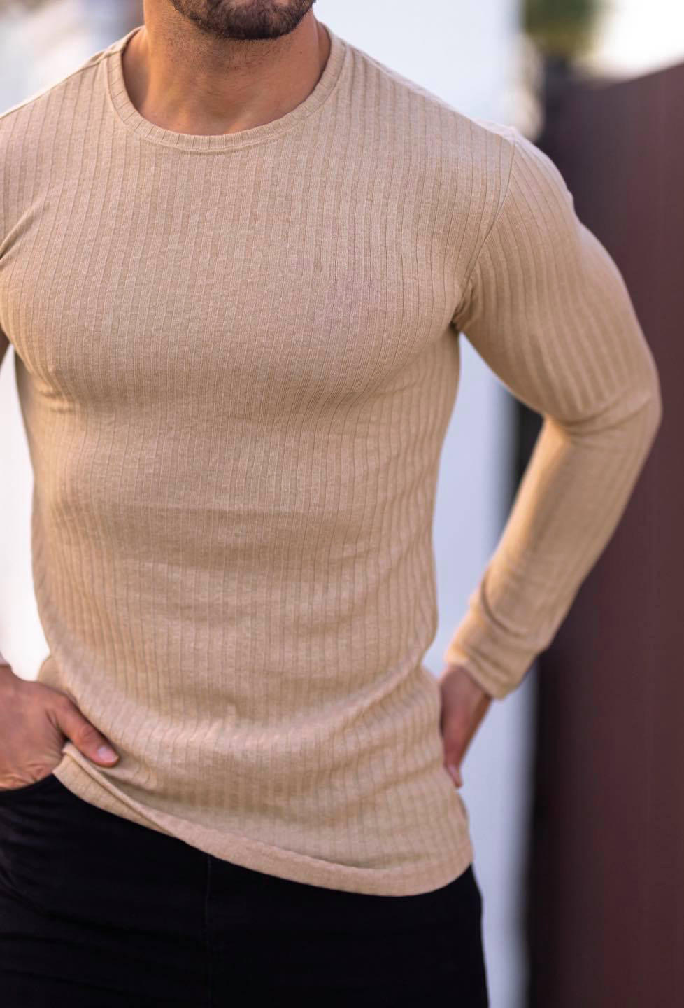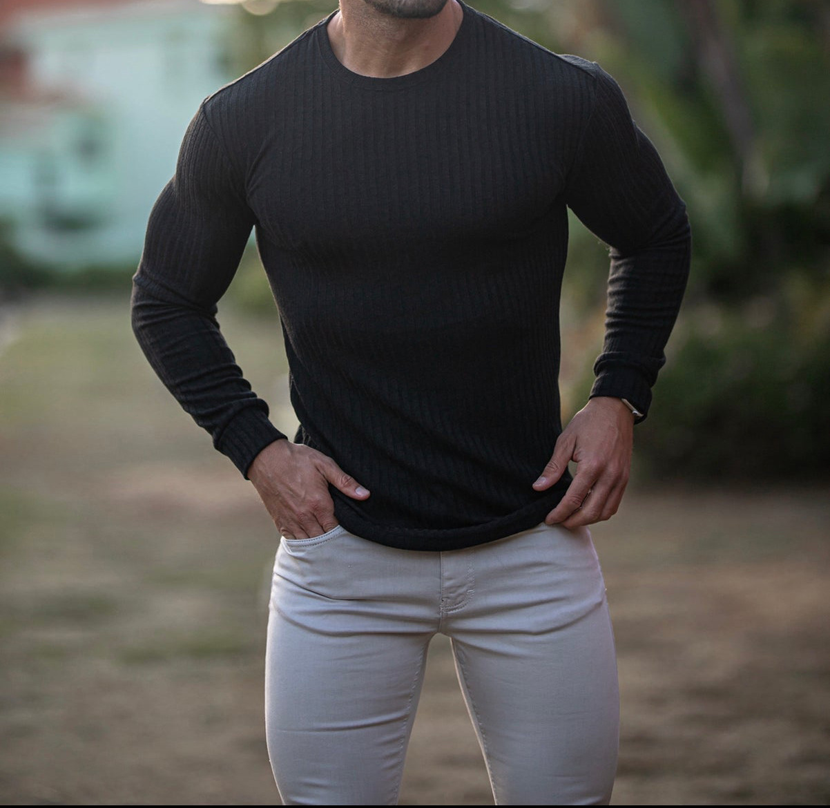 구미 국경 해외 무역 소원 남자 가을 스포츠 피트니스 레저 스탠드 칼라 탄성 세로 스트립 라운드 넥 긴팔 티셔츠