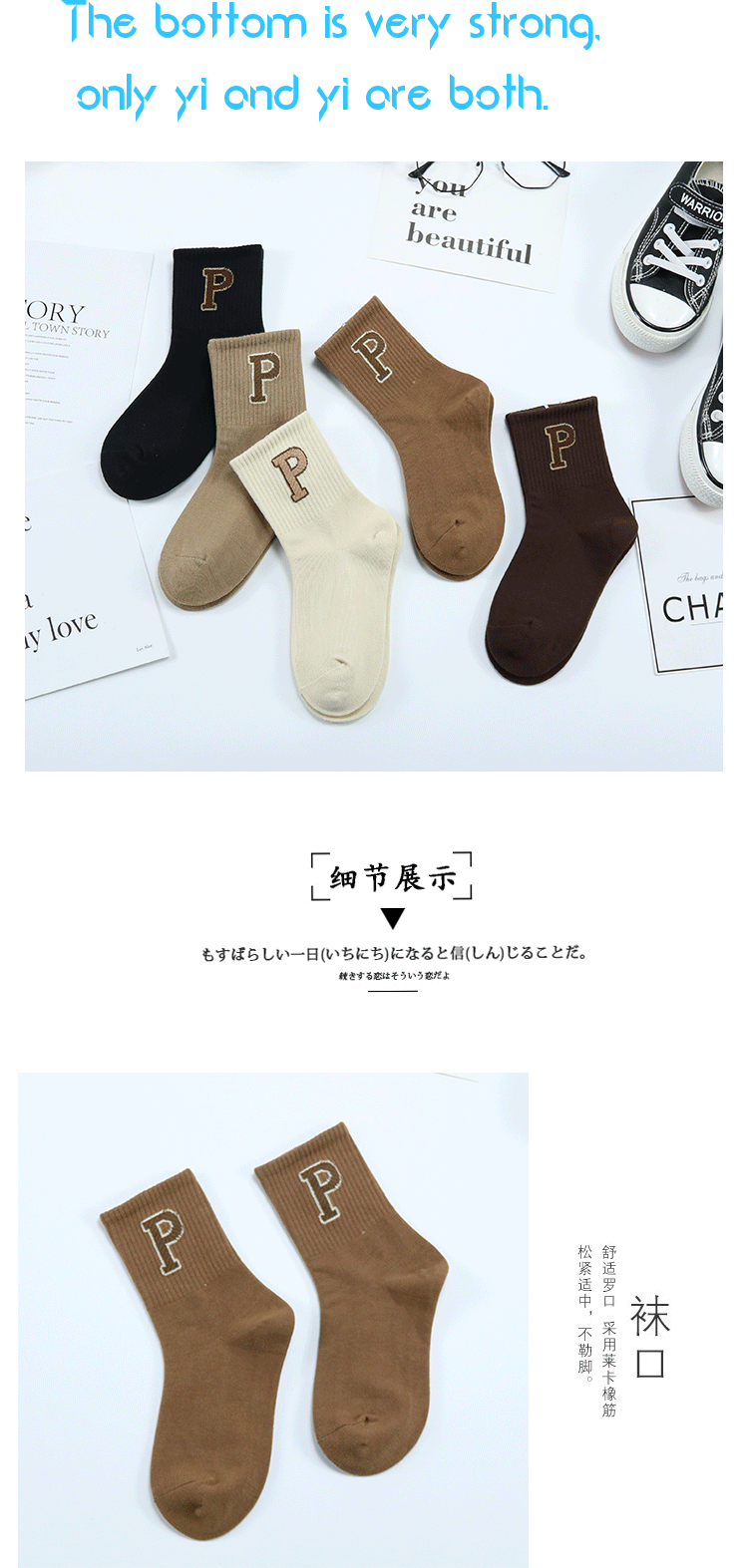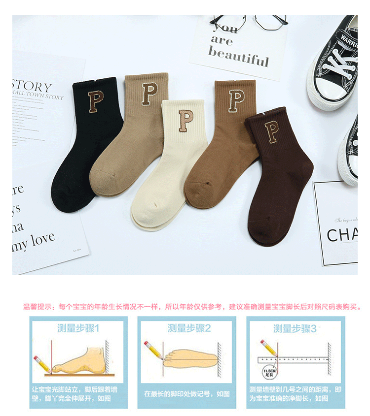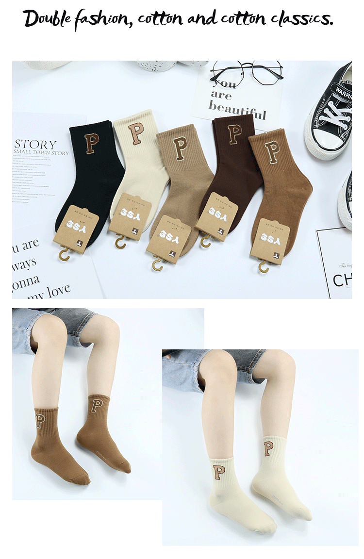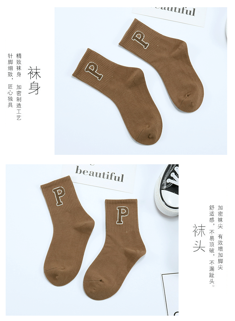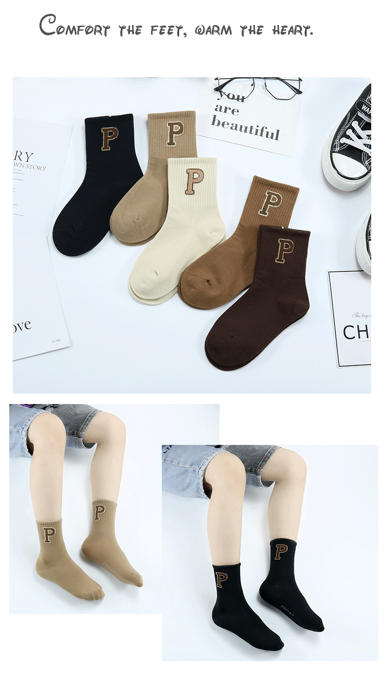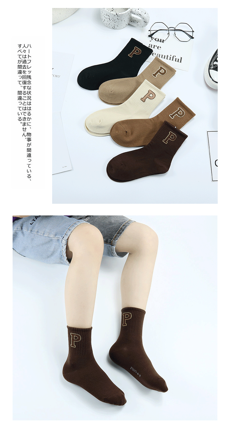 가을과 겨울 새로운 두꺼운 한국식 P 문자 중간 종아리 양말 코튼 다크 브라운 트렌디 한 브랜드 어린이 양말스토어 가기