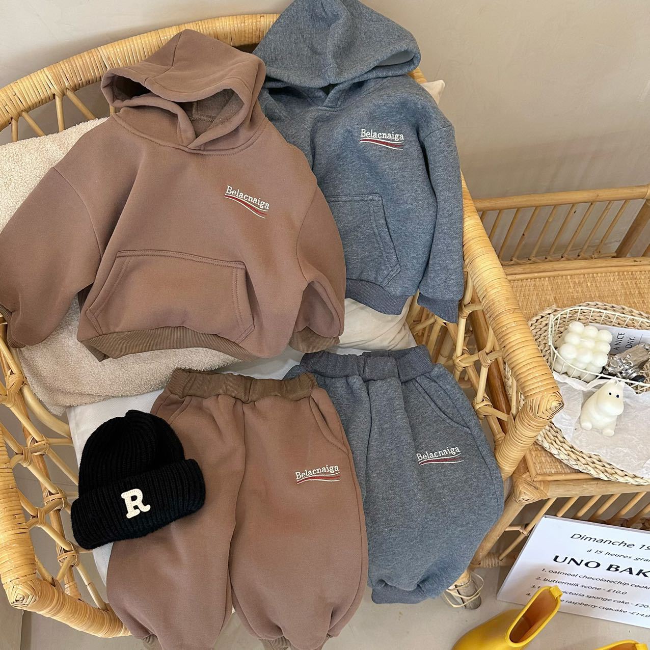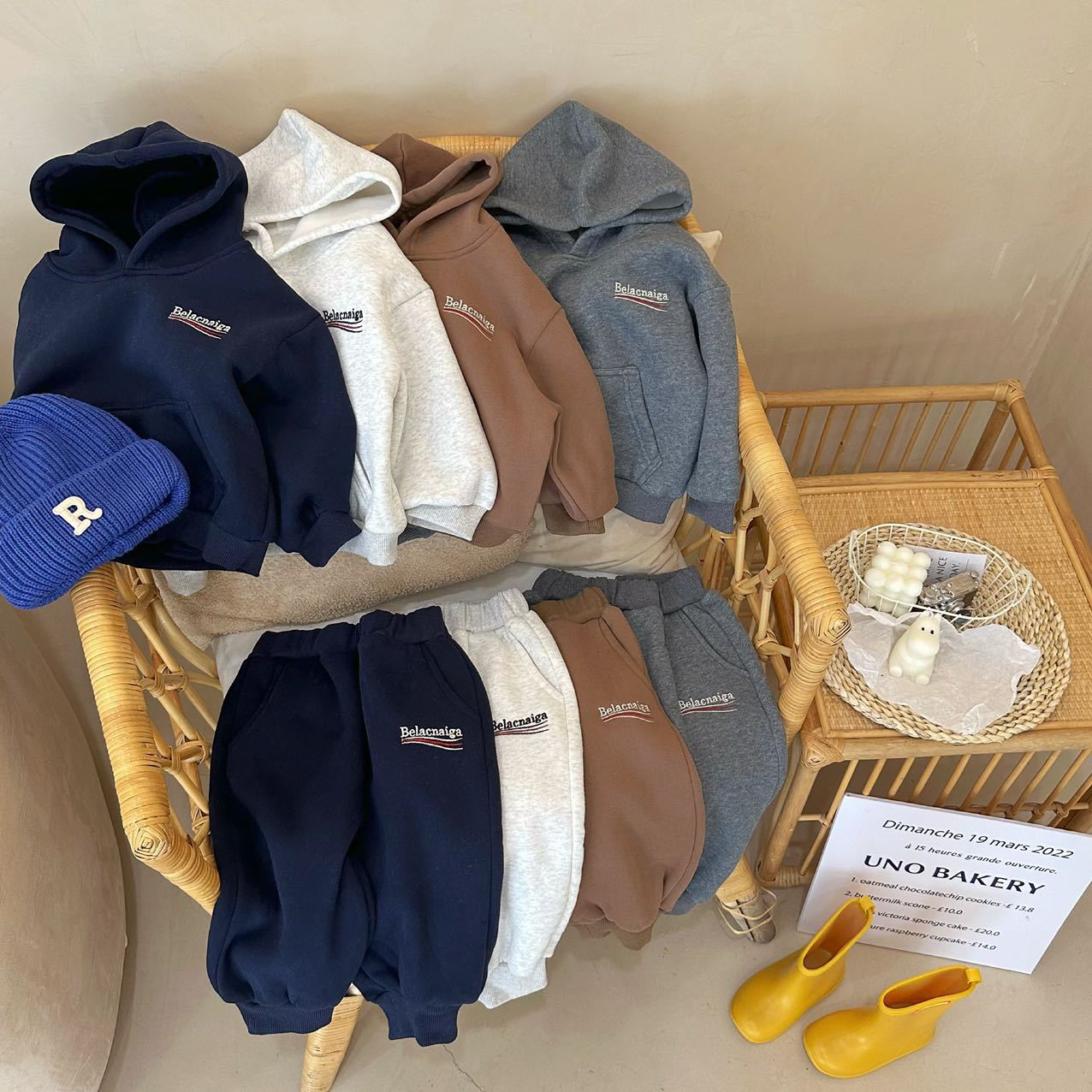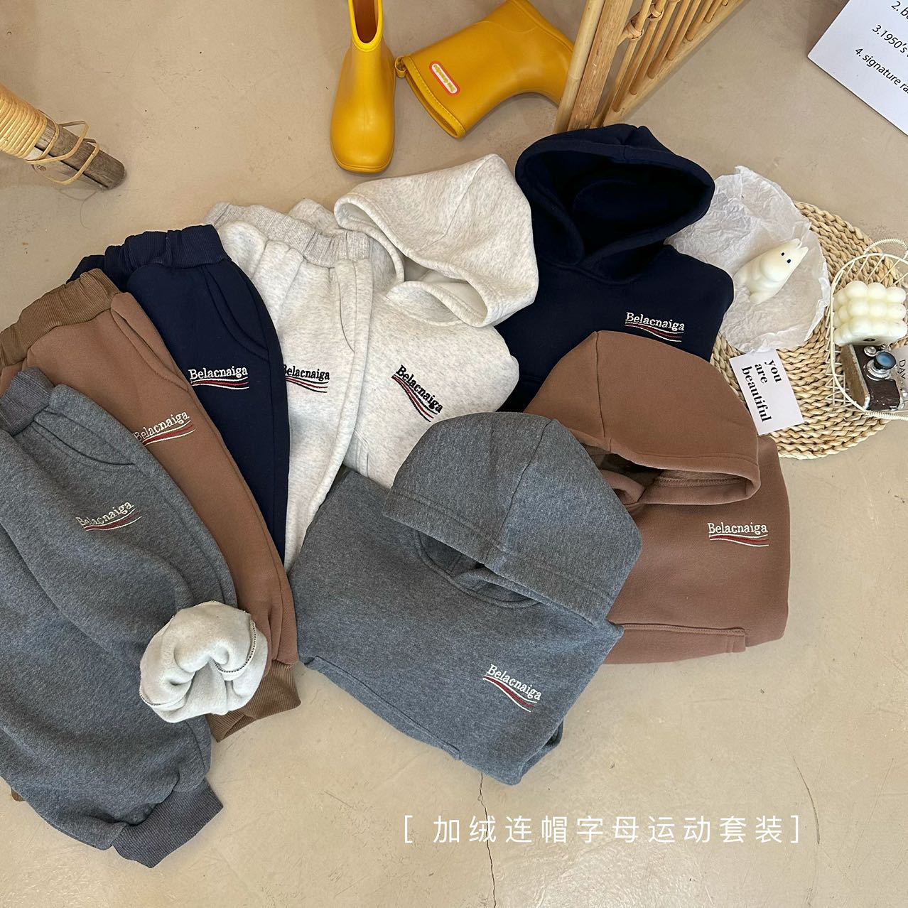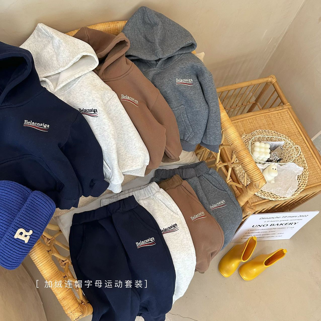 겨울 어린이용 후드 세트 남아 여아용 영어 후드 스웨트셔츠 따뜻한 스웨트팬츠 투피스 세트 유아용스토어 가기