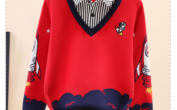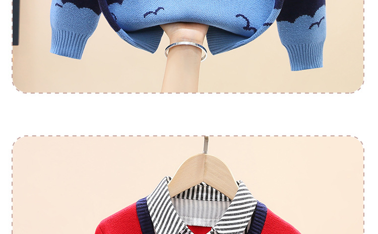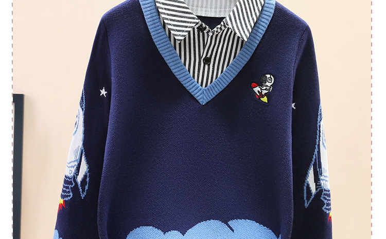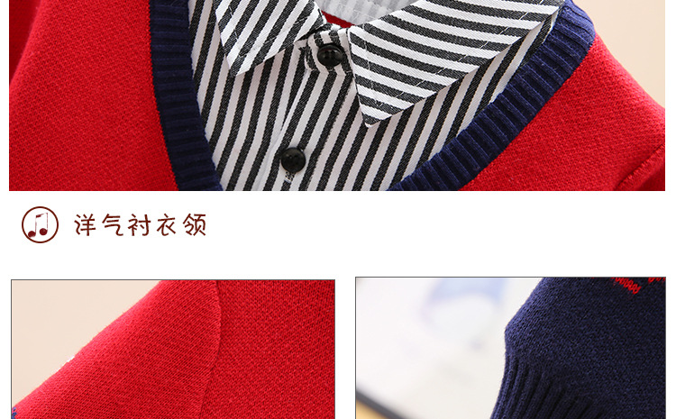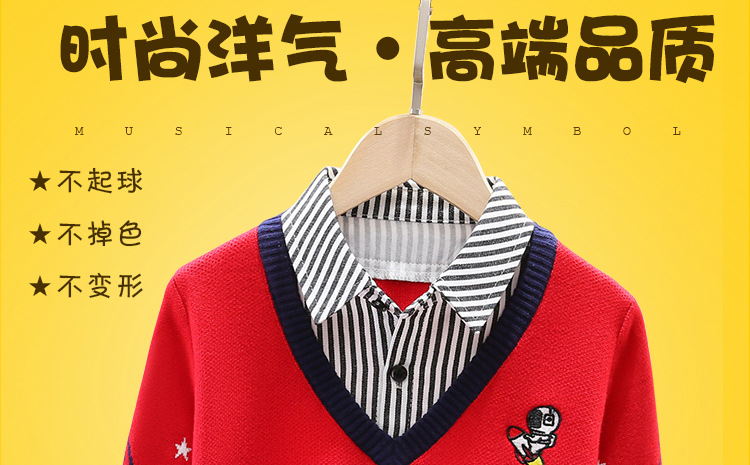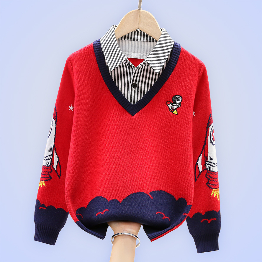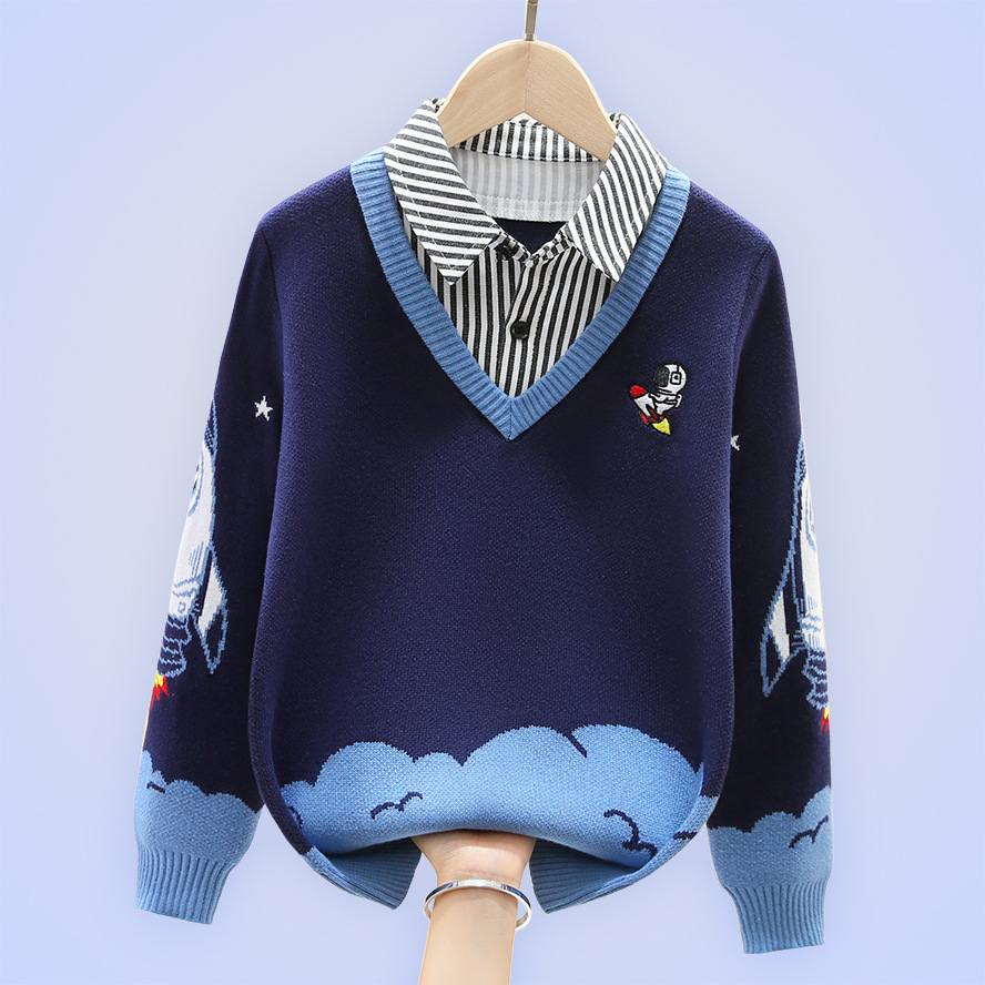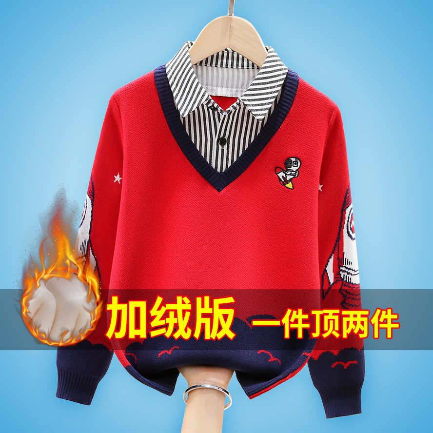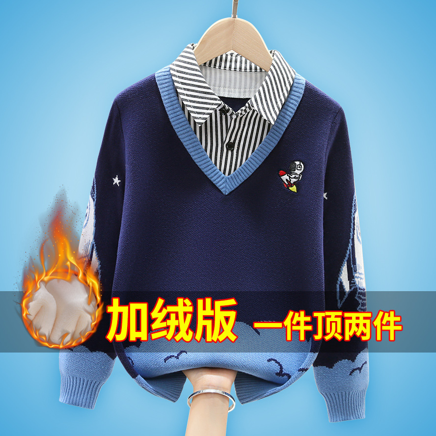 소년 스웨터 가짜 두 조각 가을과 겨울 새로운 2023 잘 생긴 소년 셔츠 칼라 풀오버 어린이 스웨터 기모 두껍습니다.스토어 가기