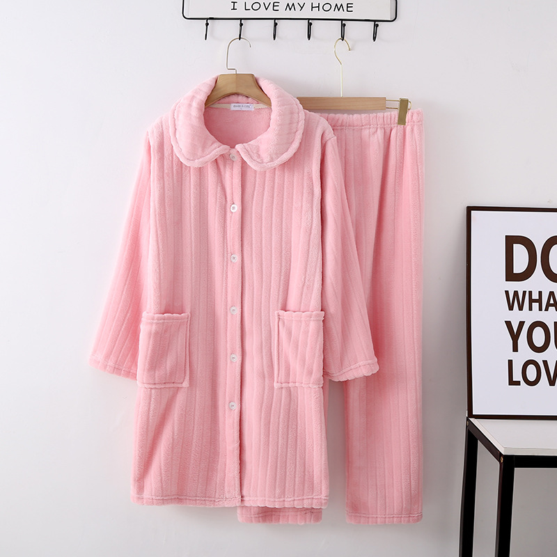 秋冬新款加厚保暖情侣 法兰绒坑条圆领纽扣长裙长袍+长裤套装