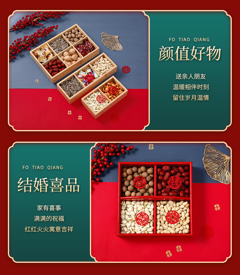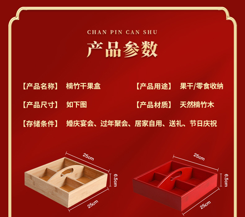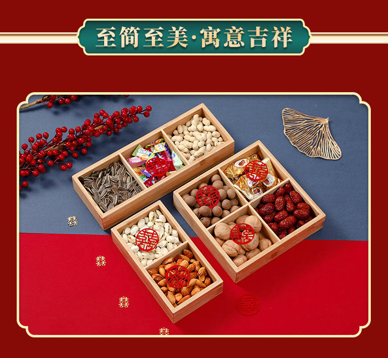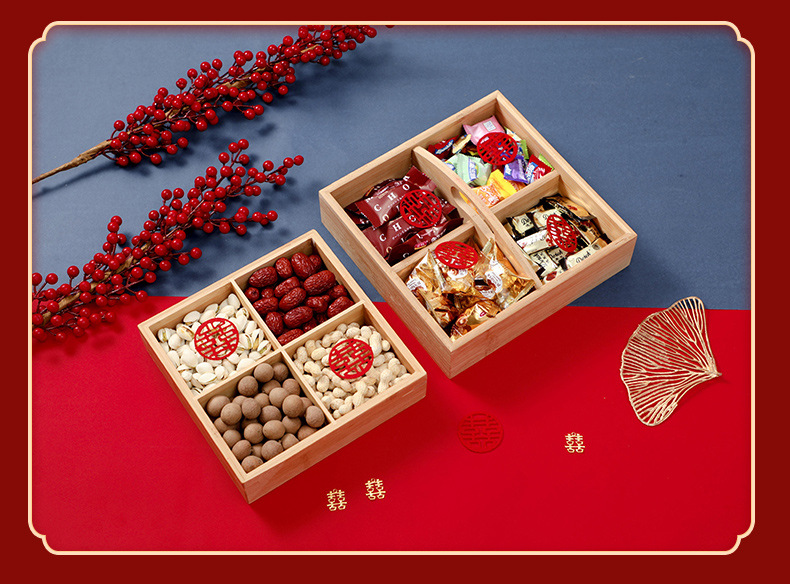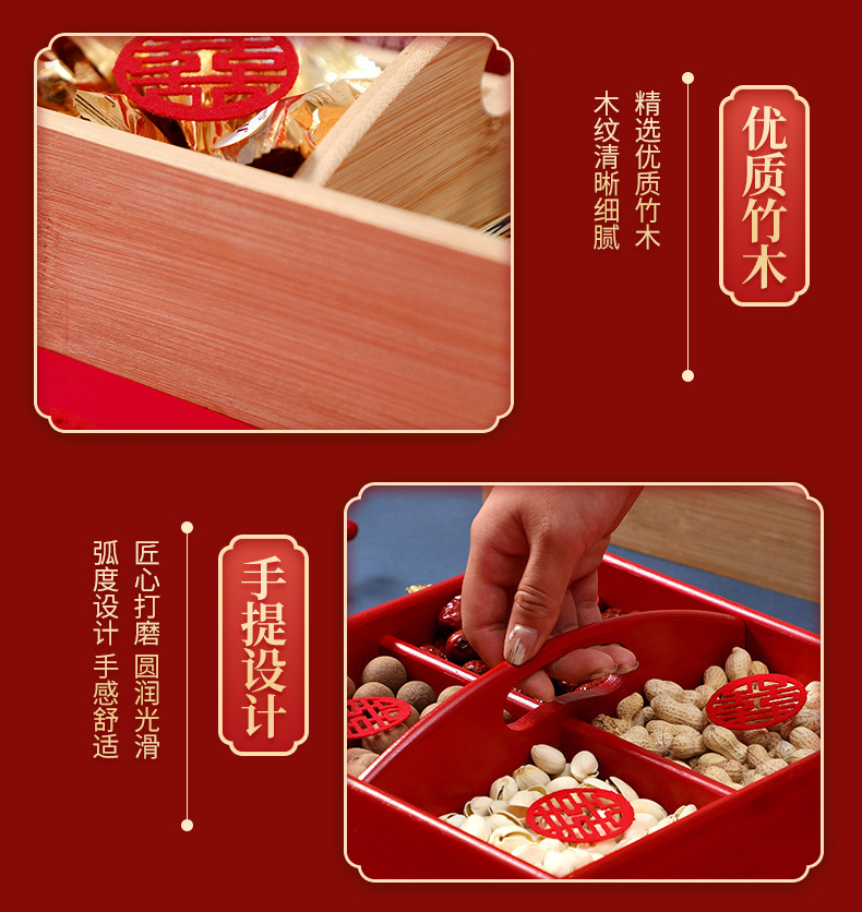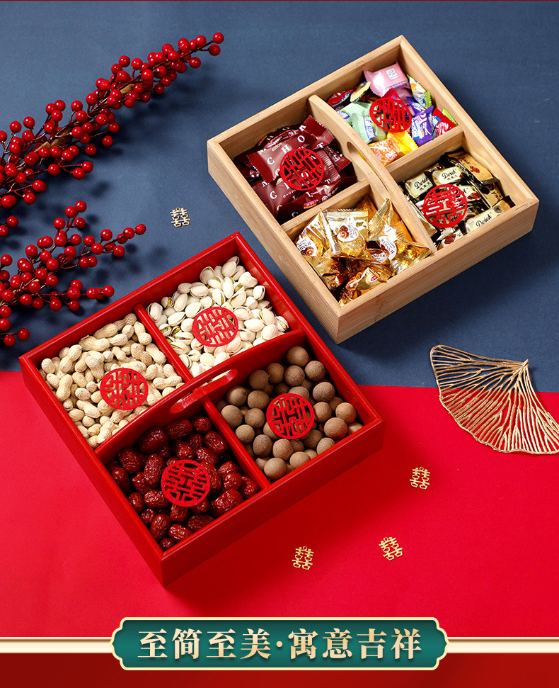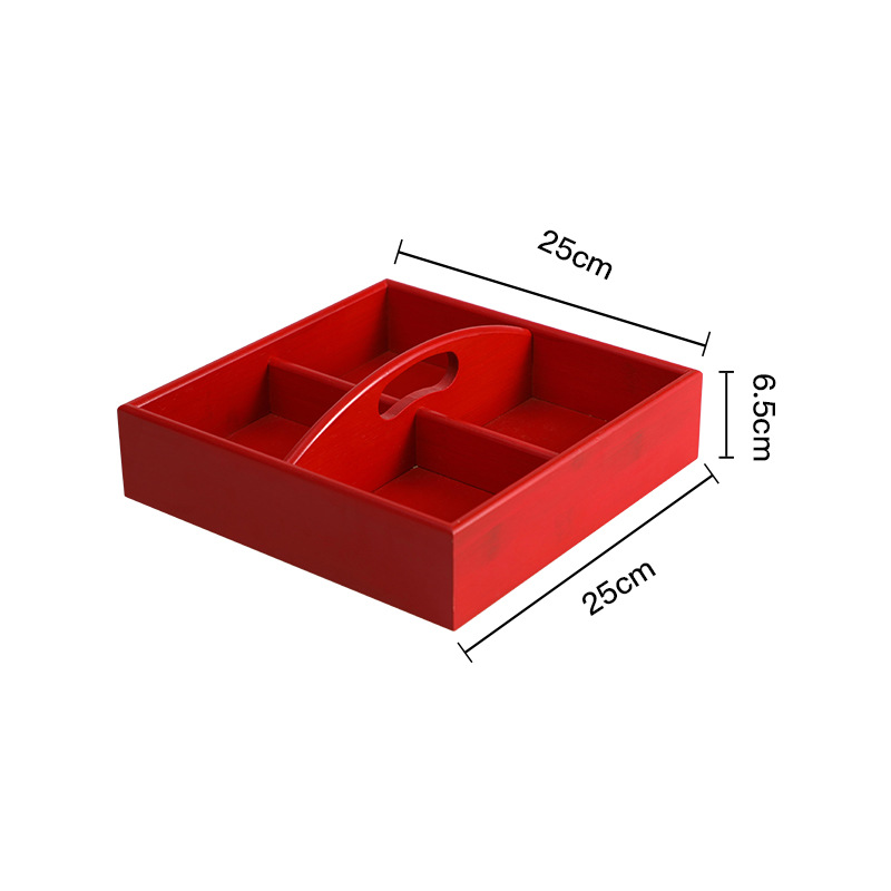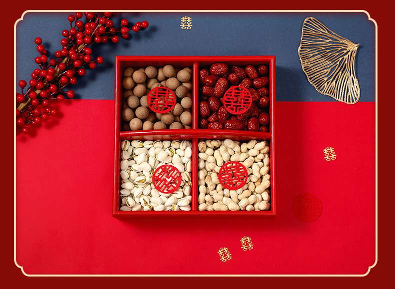 네 칸 건과일 상자, 약혼식 장식, 손잡이, 거실 테이블, 심플한 다중 칸 수납, 빨간색 트레이, 나무 재질, 결혼식용스토어 가기