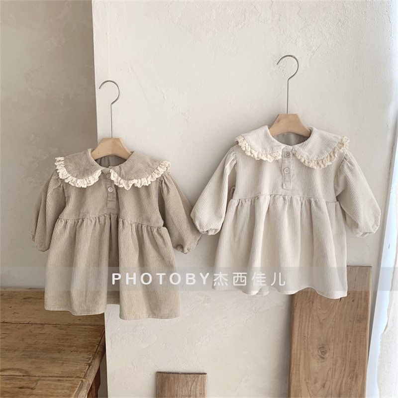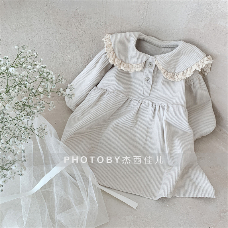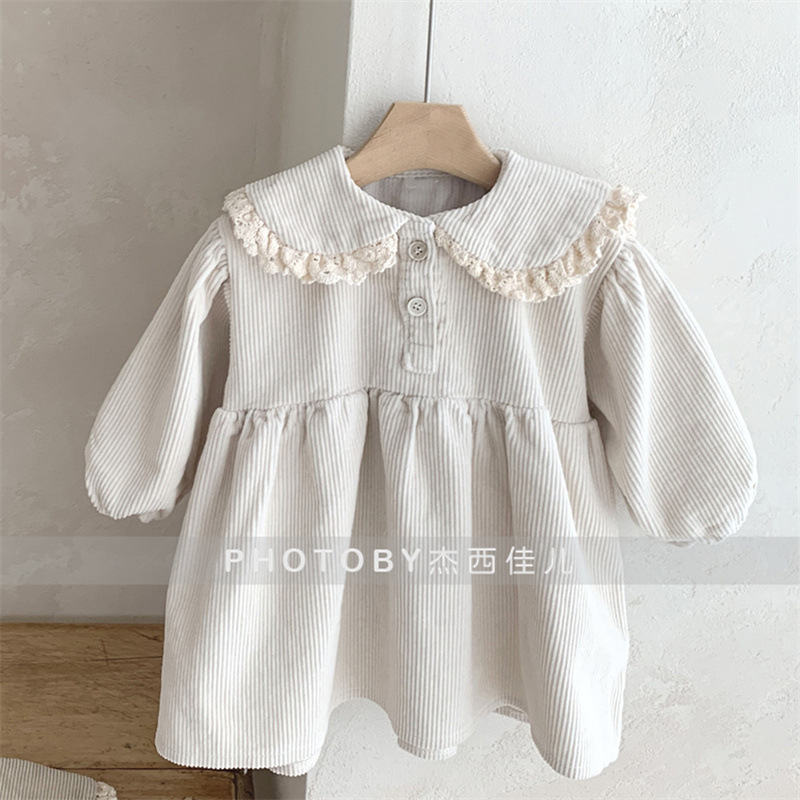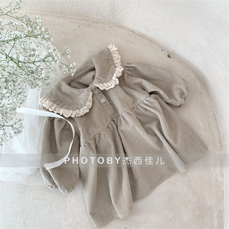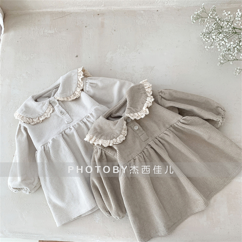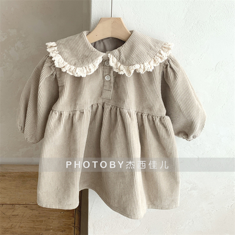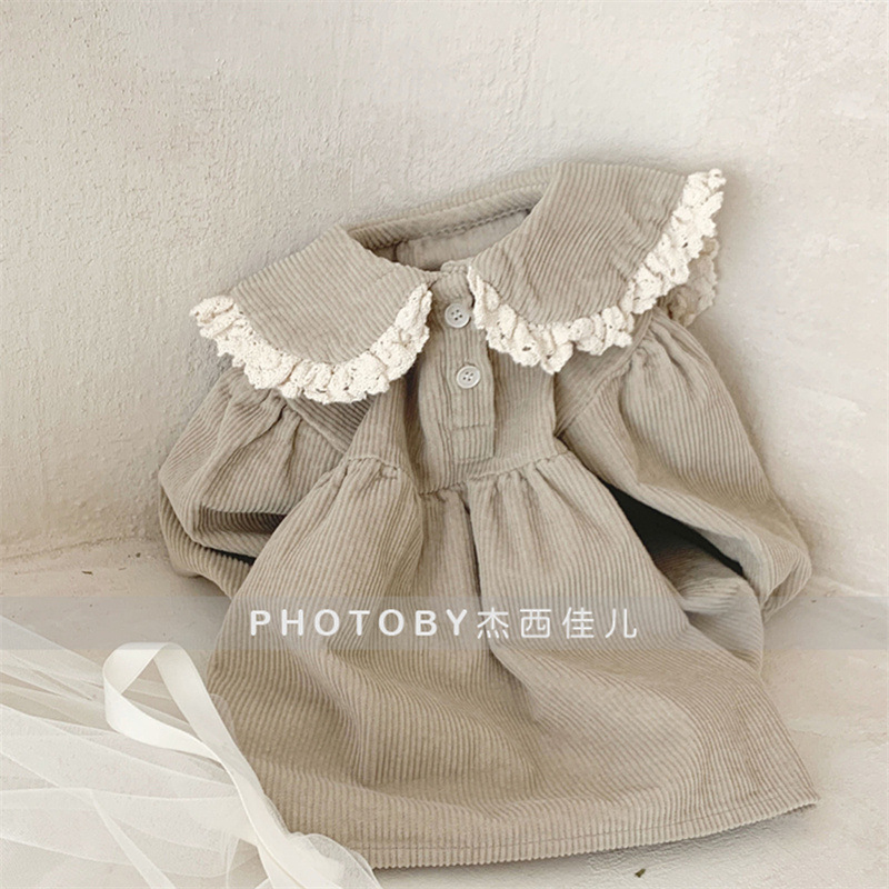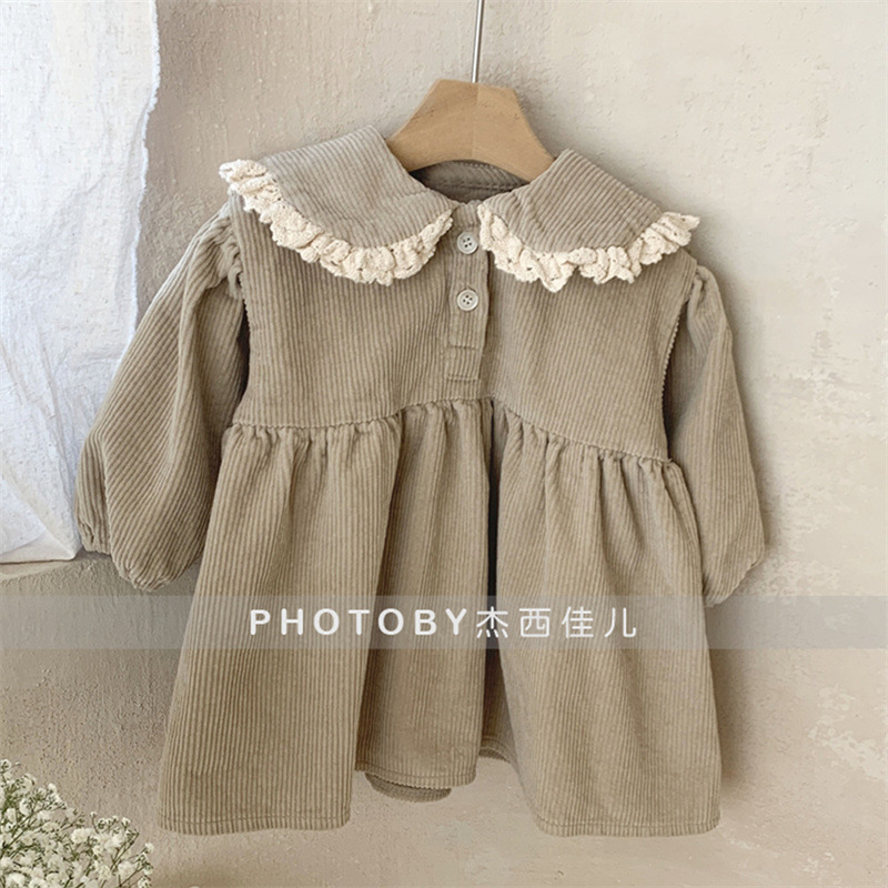 Ins 한국식 소녀 아동복 가을과 겨울 원피스 달콤한 코듀로이 소녀의 공주 원피스 레이스 옷깃 긴 소매 원피스