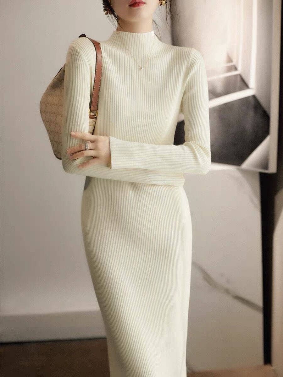가을과 겨울 새로운 하프 하이 칼라 코트 긴 스웨터 원피스 여성용 슬림 핏 내부 베이스 긴 소매 니트 원피스