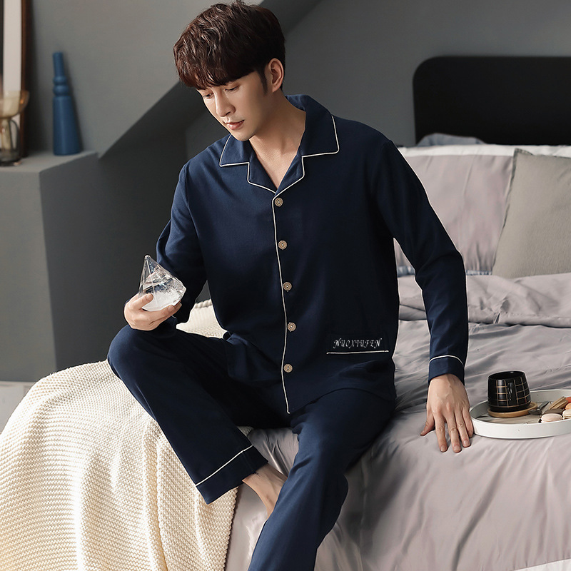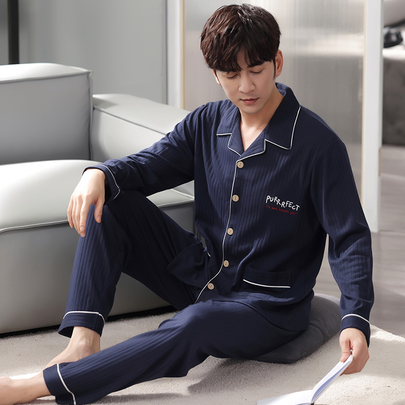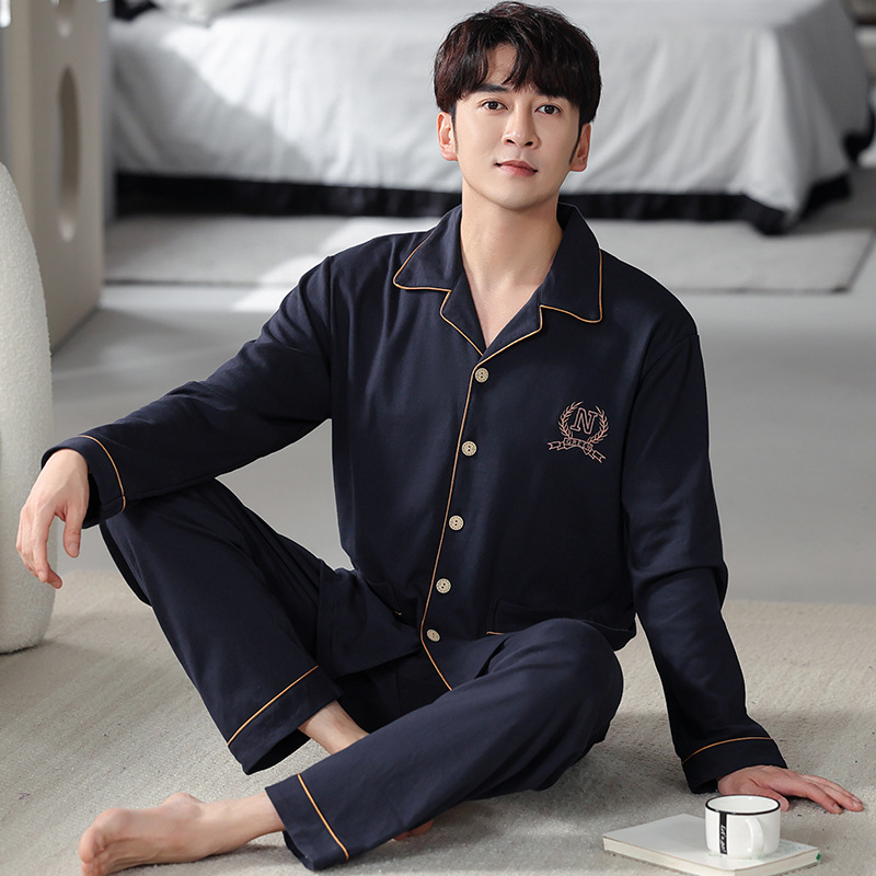 2025 새로운 잠옷 남자 가을, 겨울 면화 느슨한 긴팔 카디건 옷깃 하이 엔드 홈웨어 세트