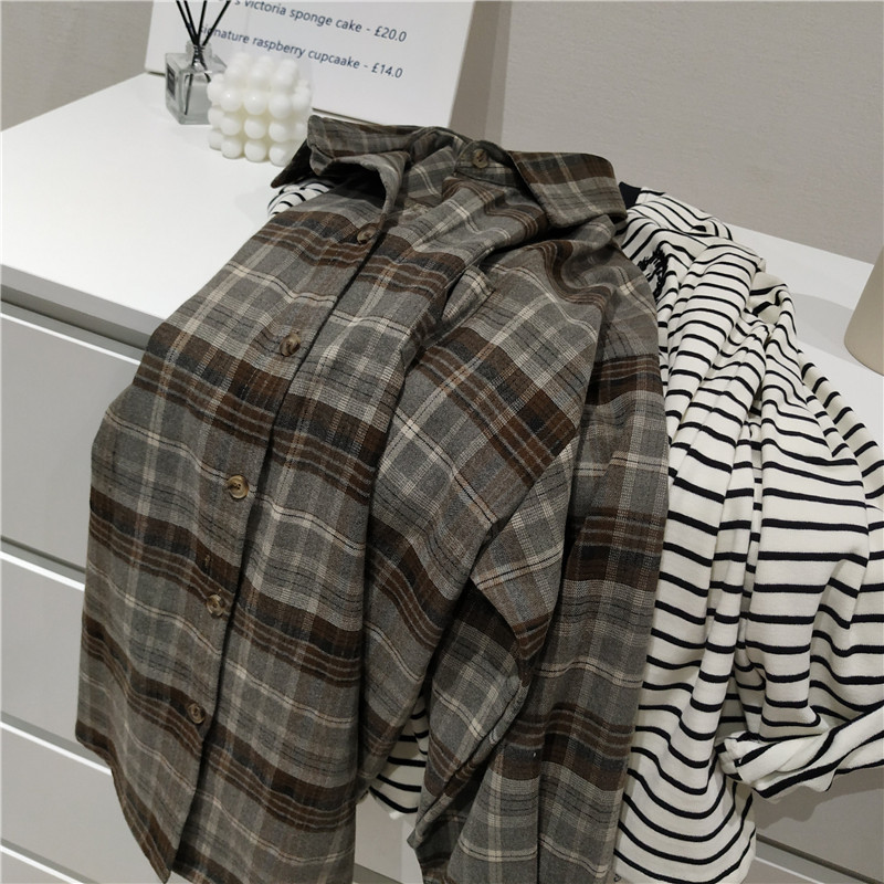일본식 캐주얼 느슨한 샌딩 면 격자 무늬 두꺼운 모든 매치 라펠 긴팔 셔츠 가을과 겨울 22 여성스토어 가기