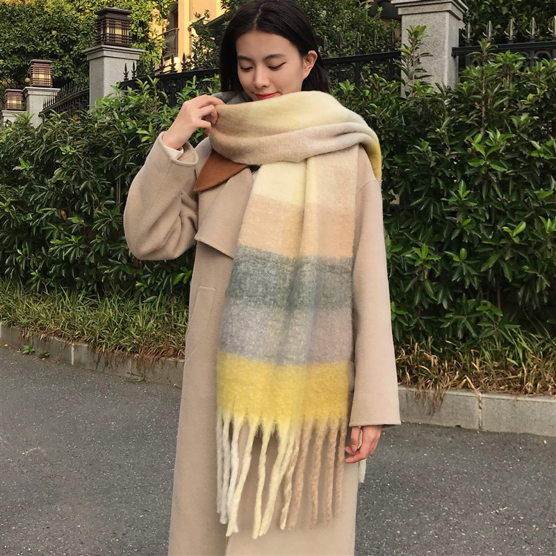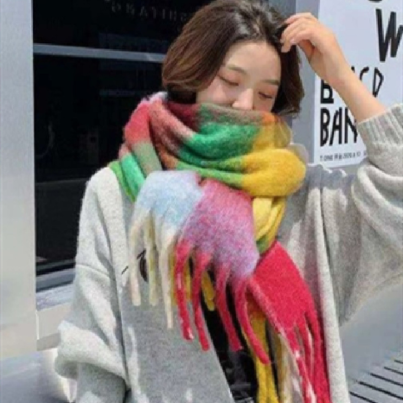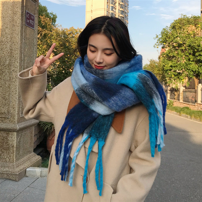 새로운 무지개 격자 무늬 스카프 여성의 겨울 클라인 블루 두꺼운 브레이드 색상 격자 무늬 따뜻한 두꺼운 Instagram 인기 귀여운