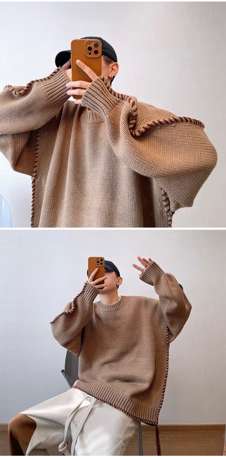 가을과 겨울 트렌디 브랜드 니트웨어 빈티지 느슨한 무거운 무게 높은 무게 손 실 다크 브라운 큰 스웨터 남성 코트스토어 가기