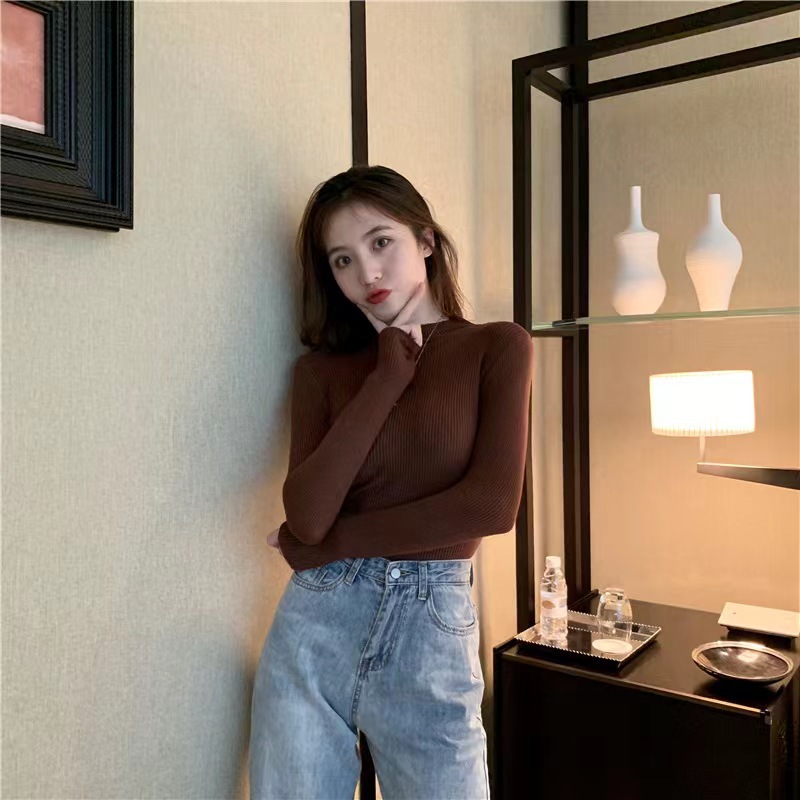 하프 터틀넥 스웨터 여성용 가을과 겨울 한국식베이스 셔츠 니트 스웨터 슬림핏 풀오버 탑 여성스토어 가기