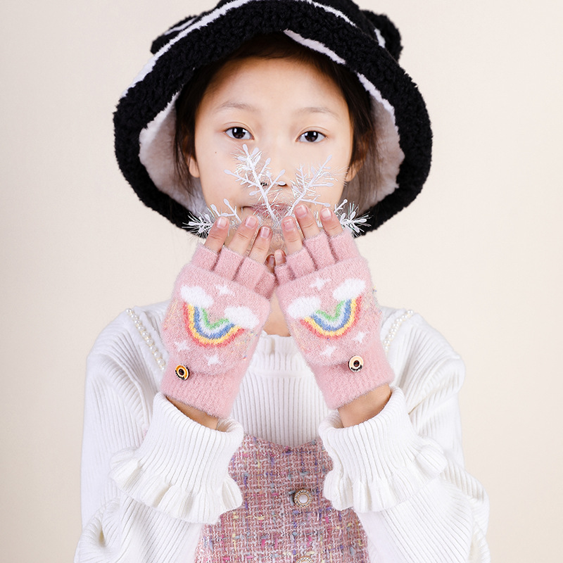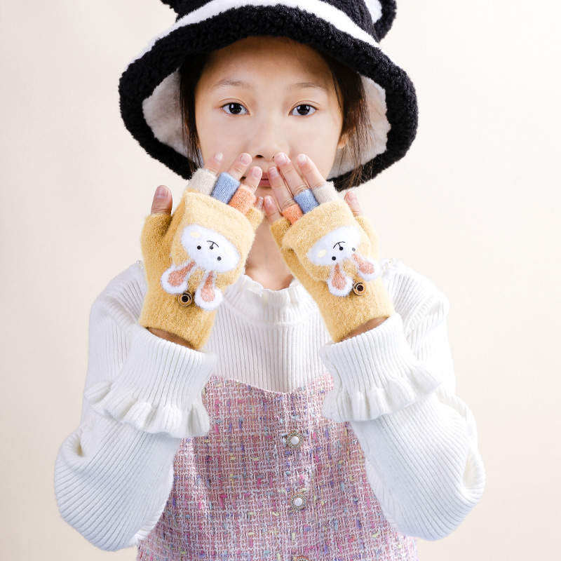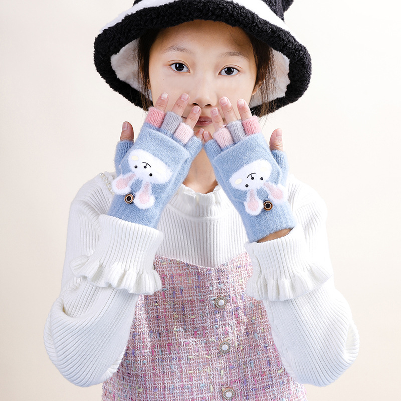 어린이 플립 커버 이중 사용 장갑 소년 니트 울 소녀 토끼 해 만화 겨울 학생 두꺼운 반 손가락 따뜻한