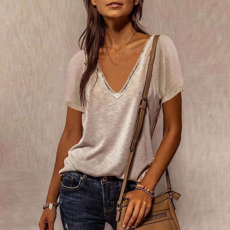 2022 아마존 EBAY 유럽과 미국의 새로운 V-넥 브론징 단색 면 반팔 루즈한 티셔츠 여성 의류