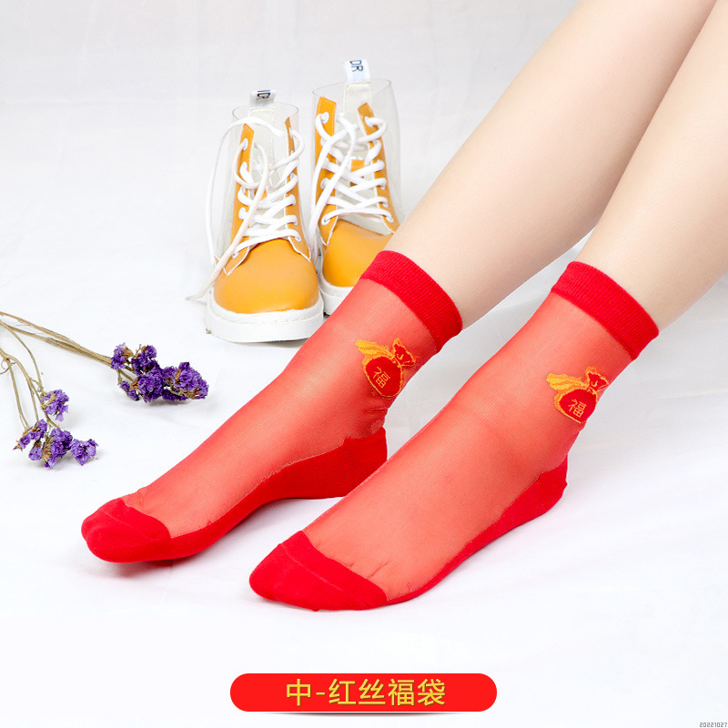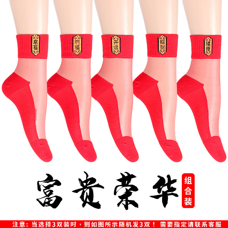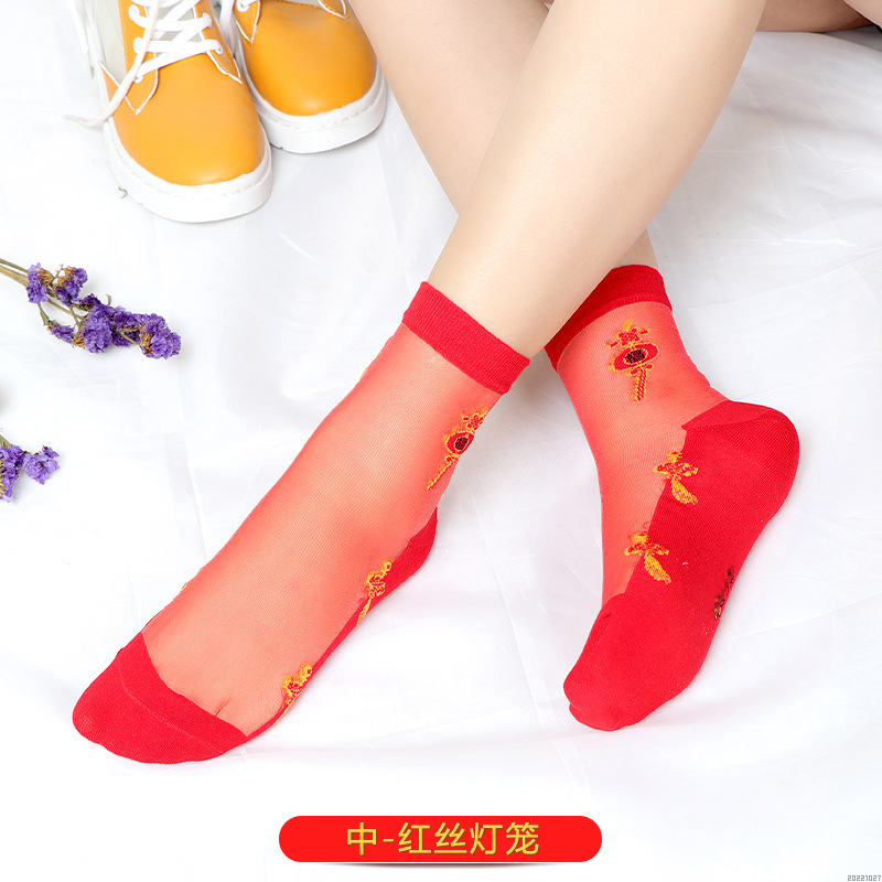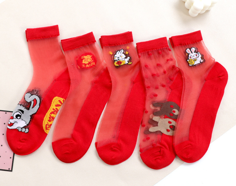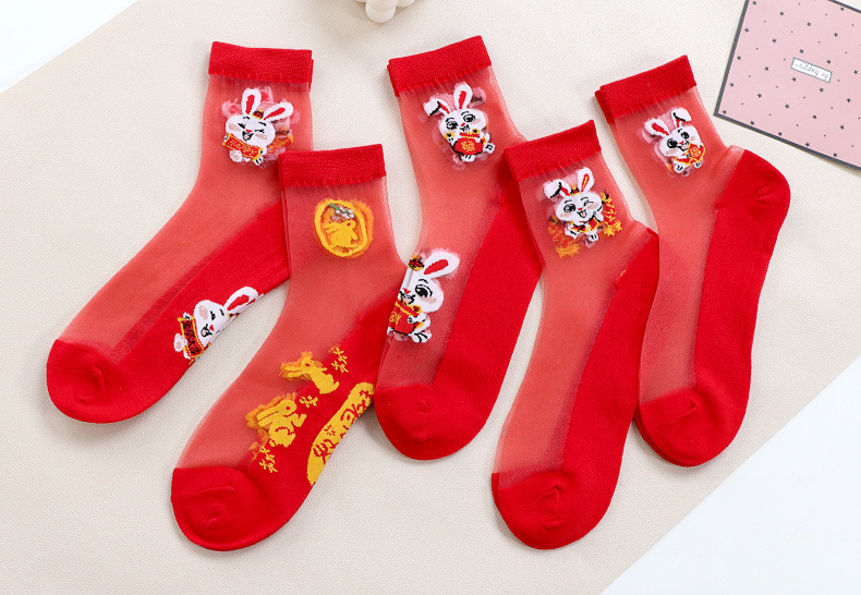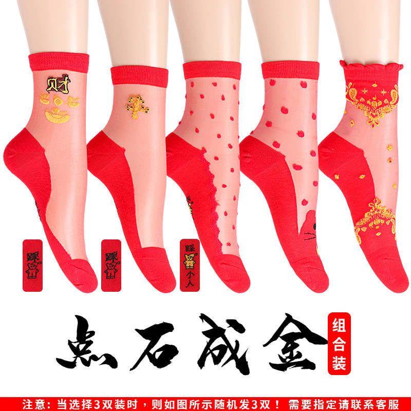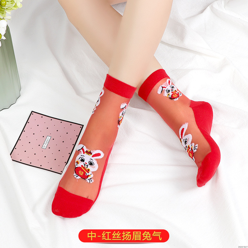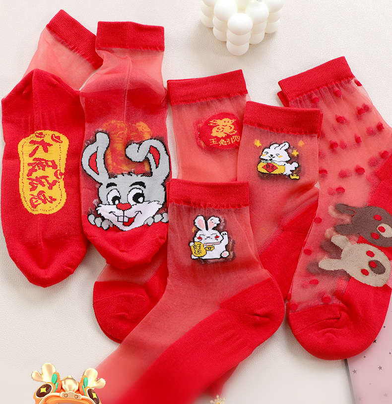 새해 빨간 양말 토끼 웨딩 레드 크리스탈 실크 코튼 하단 중간 유리 실크 양말 공장 도매스토어 가기