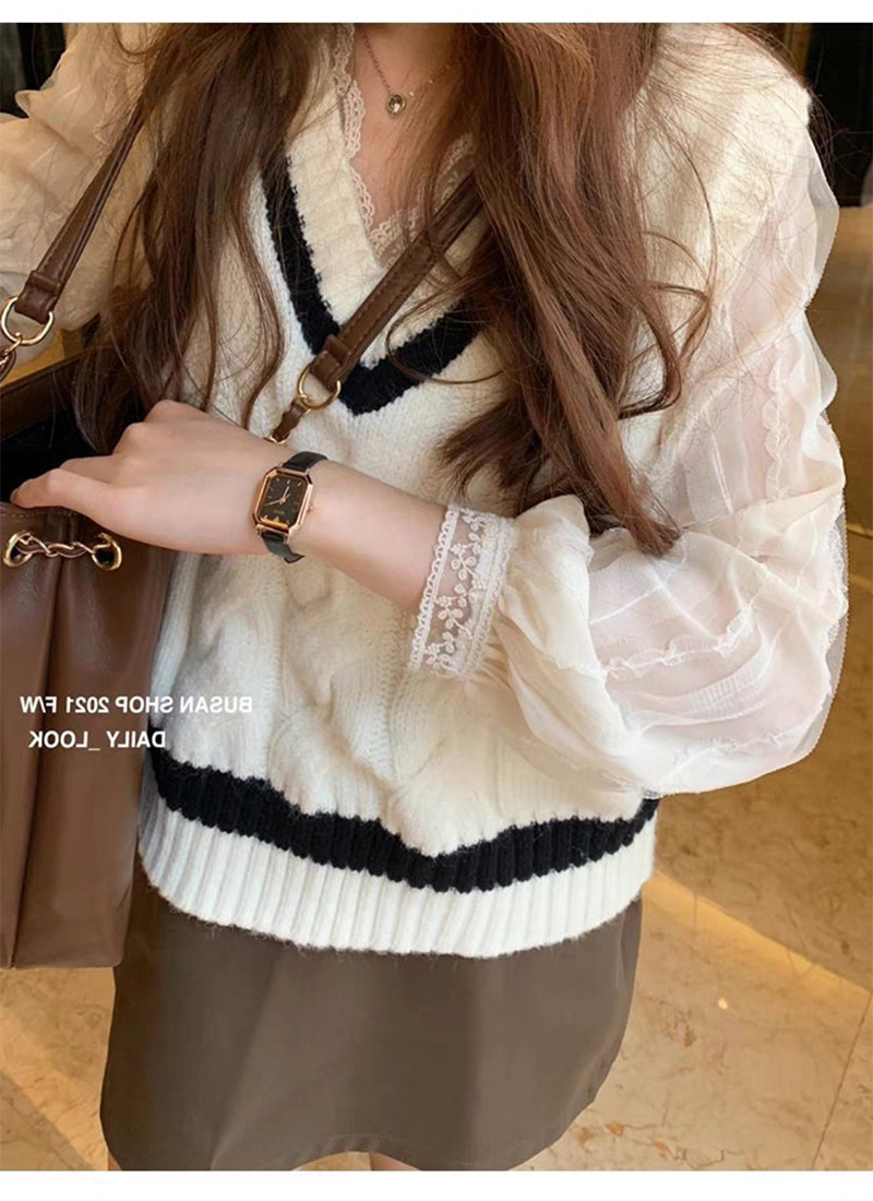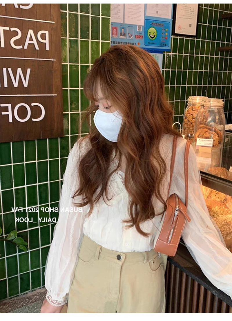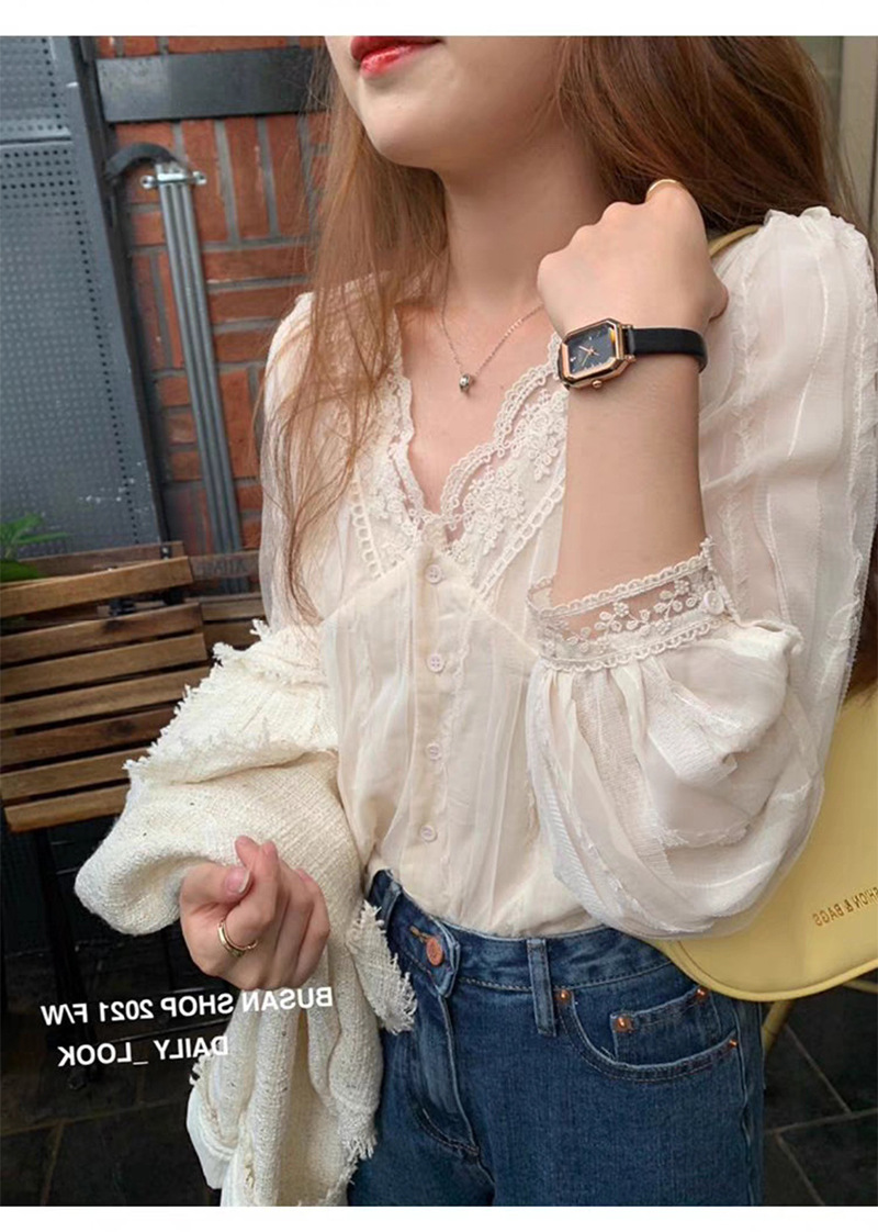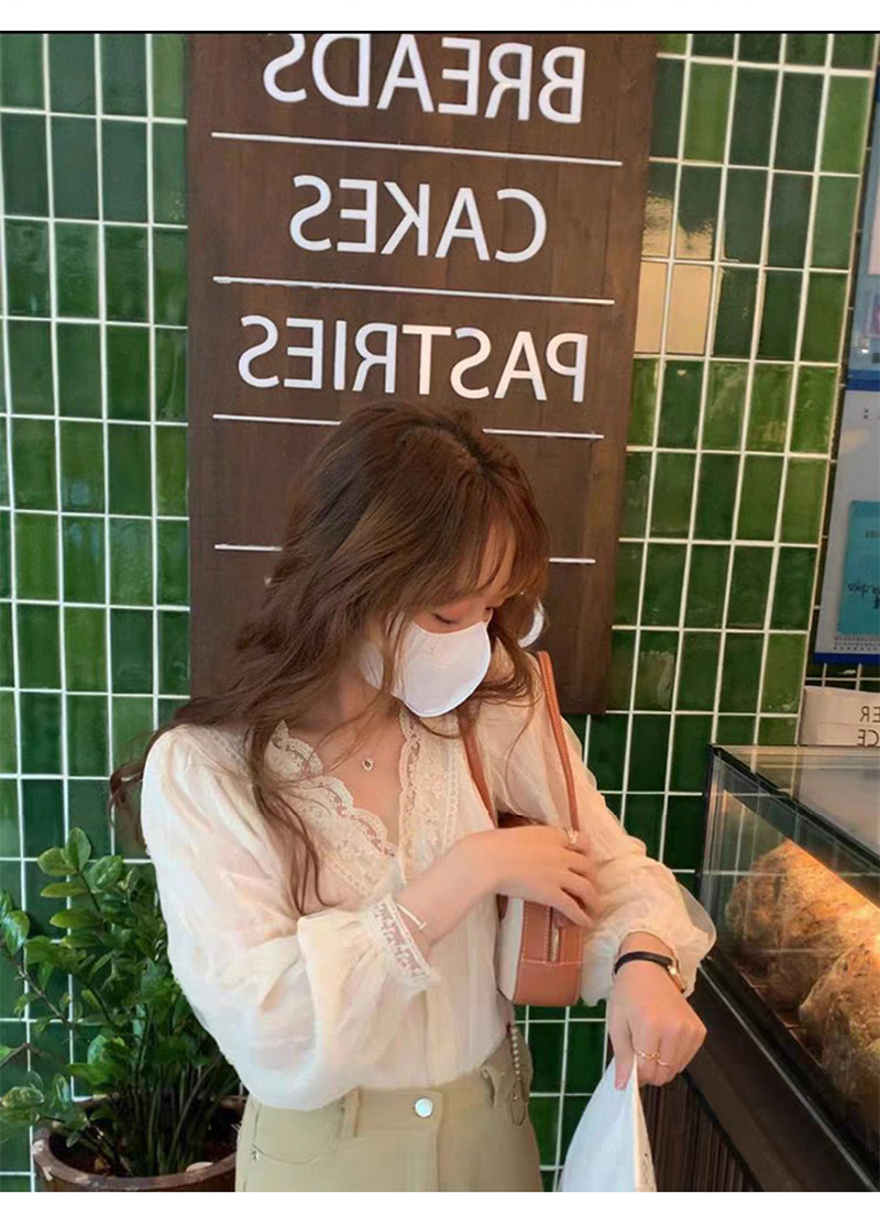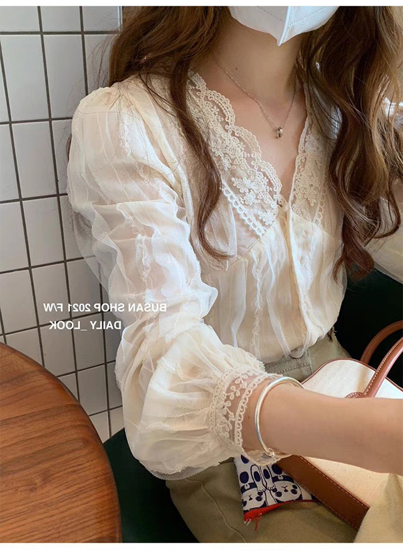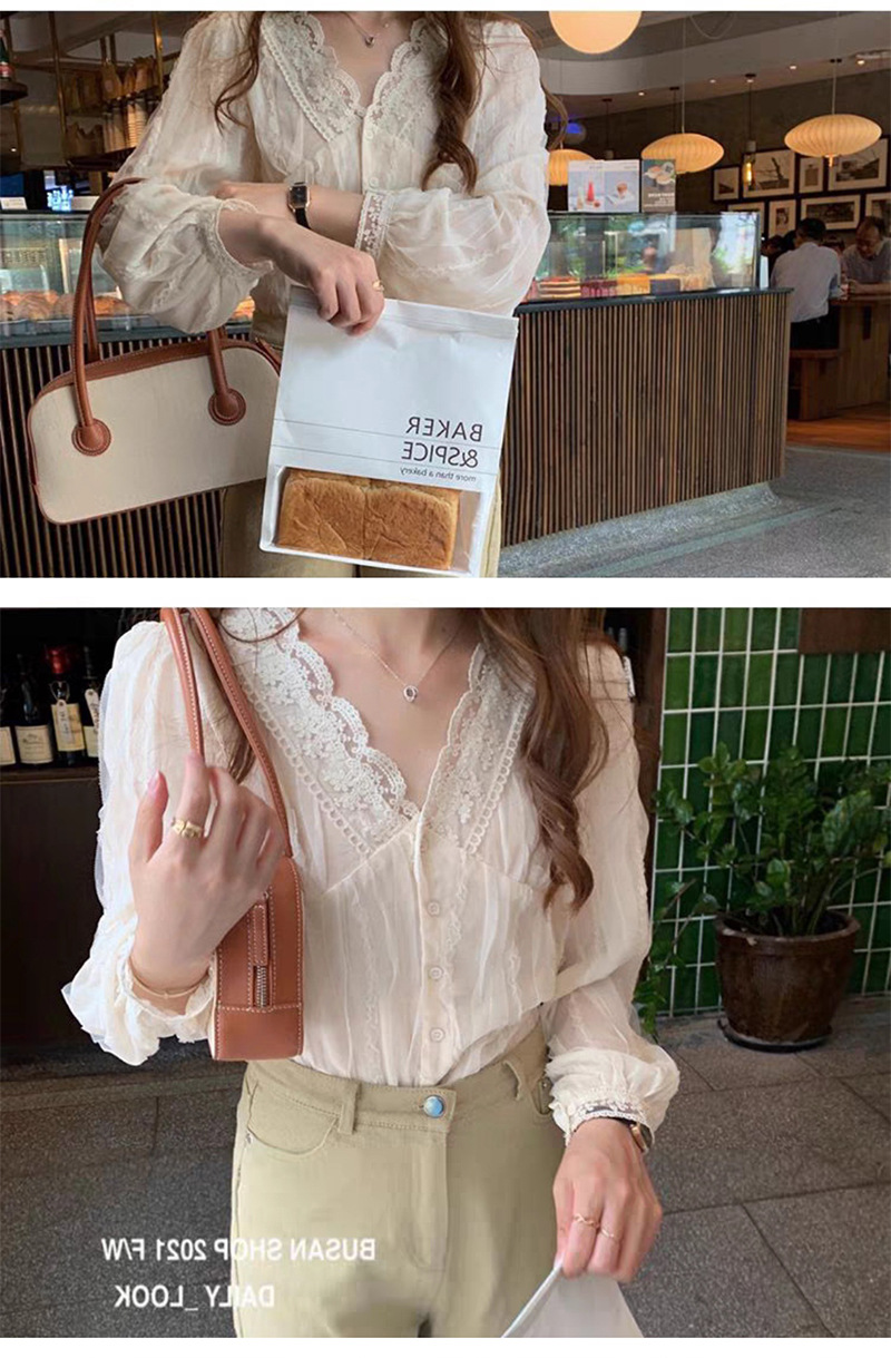 우아한 브이넥 레이스 셔츠 여성용 젠틀 올매치 쉬폰 셔츠 2023 가을 뉴 스위트 시크 디자인 센스 스몰 셔츠스토어 가기