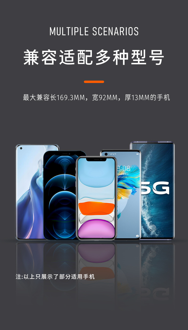 4.适配尺寸:最大兼容长169.3mm,宽92mm,厚13mm的手机