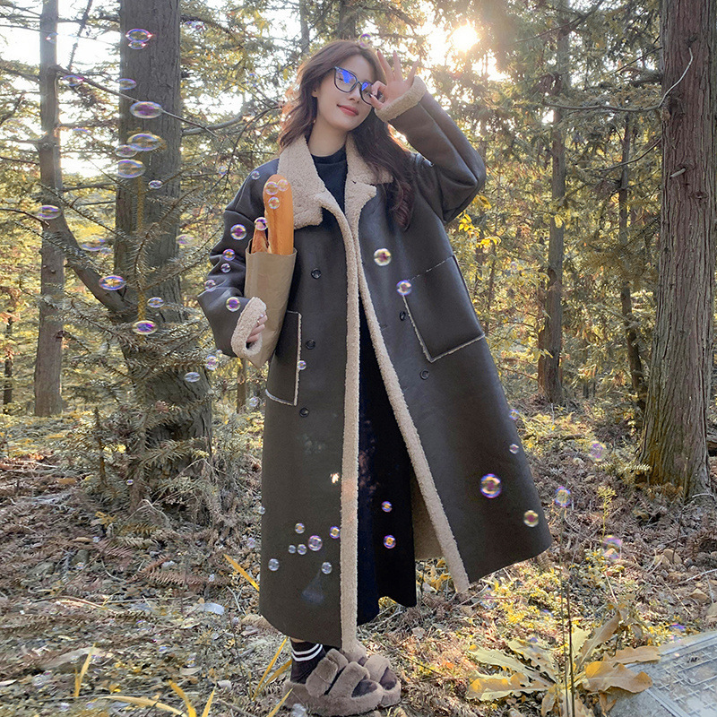 홍콩 스타일 레트로 양털 스플라이싱 디자인 더블 버튼 대형 포켓 루즈핏 중간 길이 여성용 방한 코튼 재킷