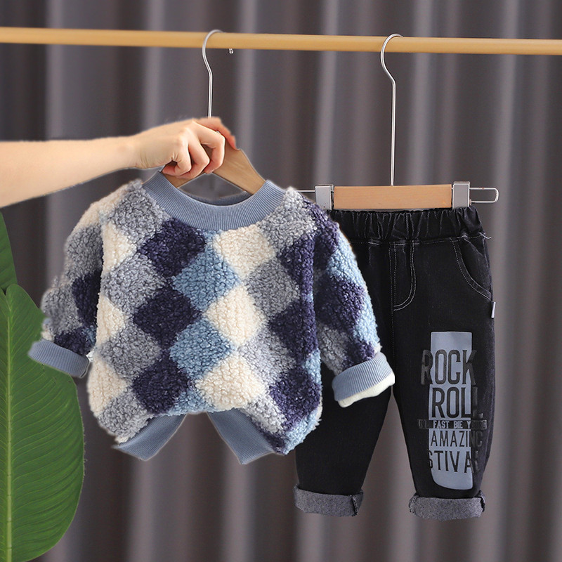 남아 겨울 세트 유행 기모 캐주얼 스포츠웨어 아기 어린이 한국식 라운드 칼라 셔츠 어린이 투피스 세트스토어 가기