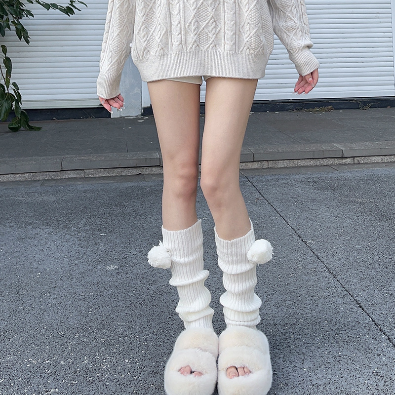 달콤한 순수한 우유 흰색 세로 줄무늬 큰 모피 공 양말 중간 종아리 더미 양말 스트레이트 발 커버