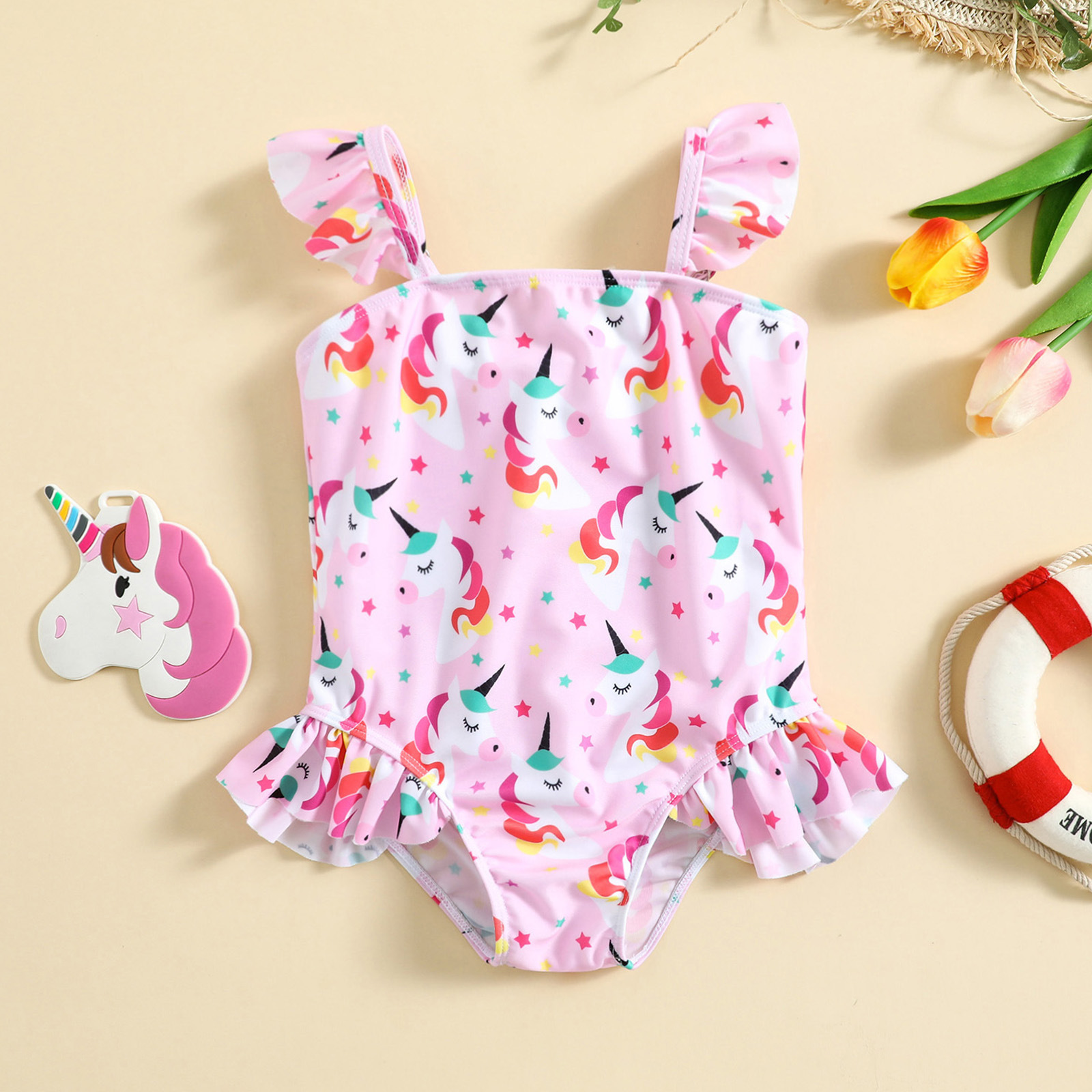 여아 수영복 유니콘 프린트 원피스 여아 수영복 퍼프 소매 작은 공주 스타일 스포티한 디자인 고탄력 편안함스토어 가기