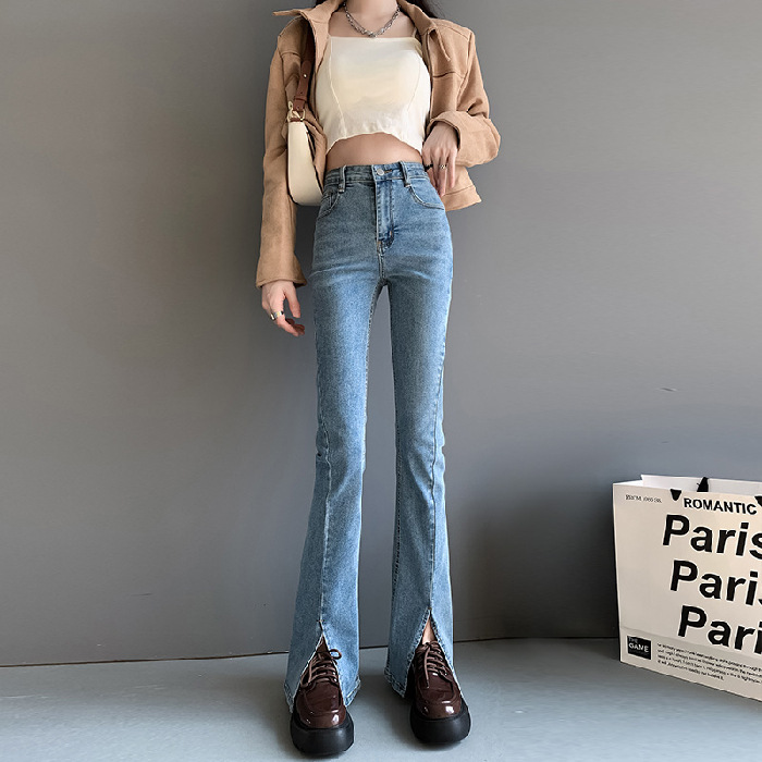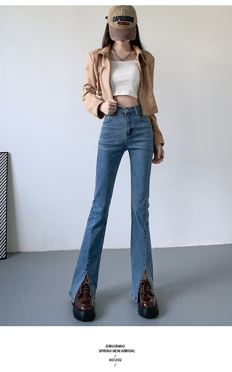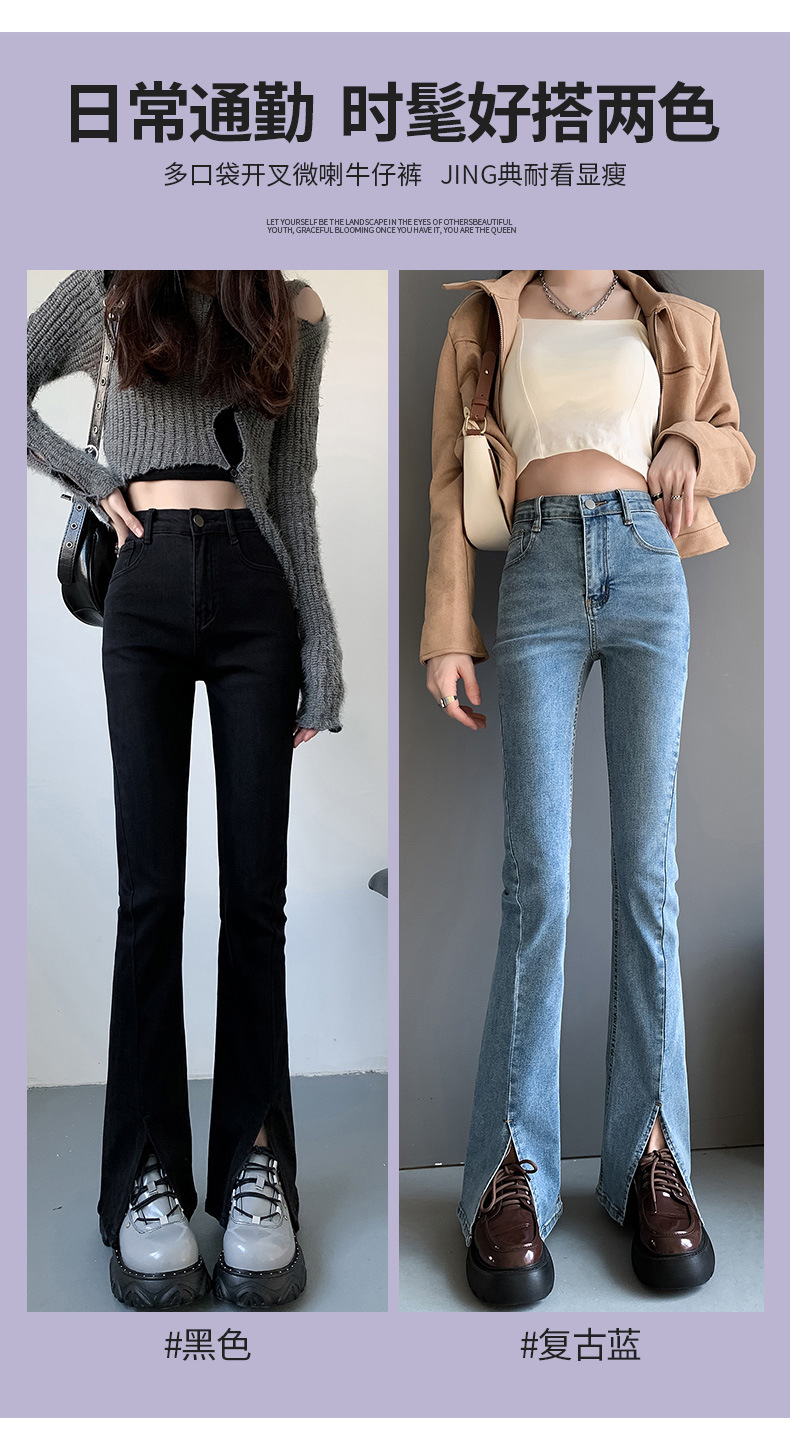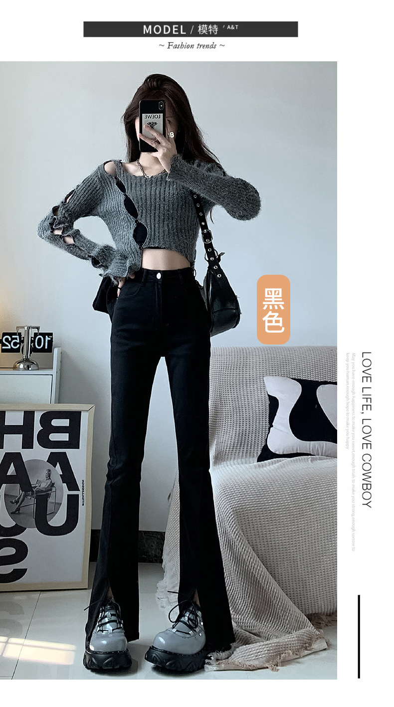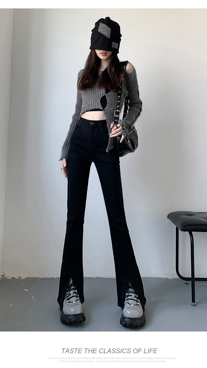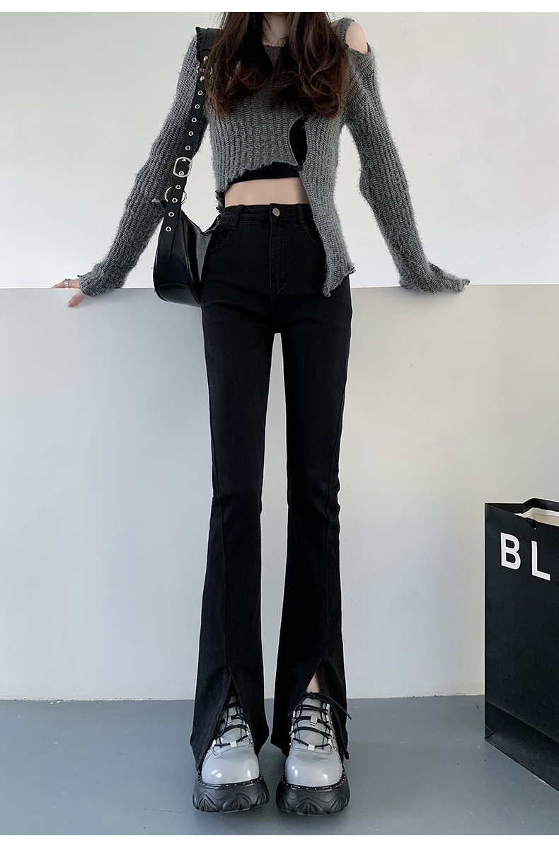 블랙 마이크로 플레어 스플릿 청바지 여성용 봄 한국식 하이 웨이스트 슬림 핏 슬리밍 탄성 루즈 와이드 레그 바지스토어 가기
